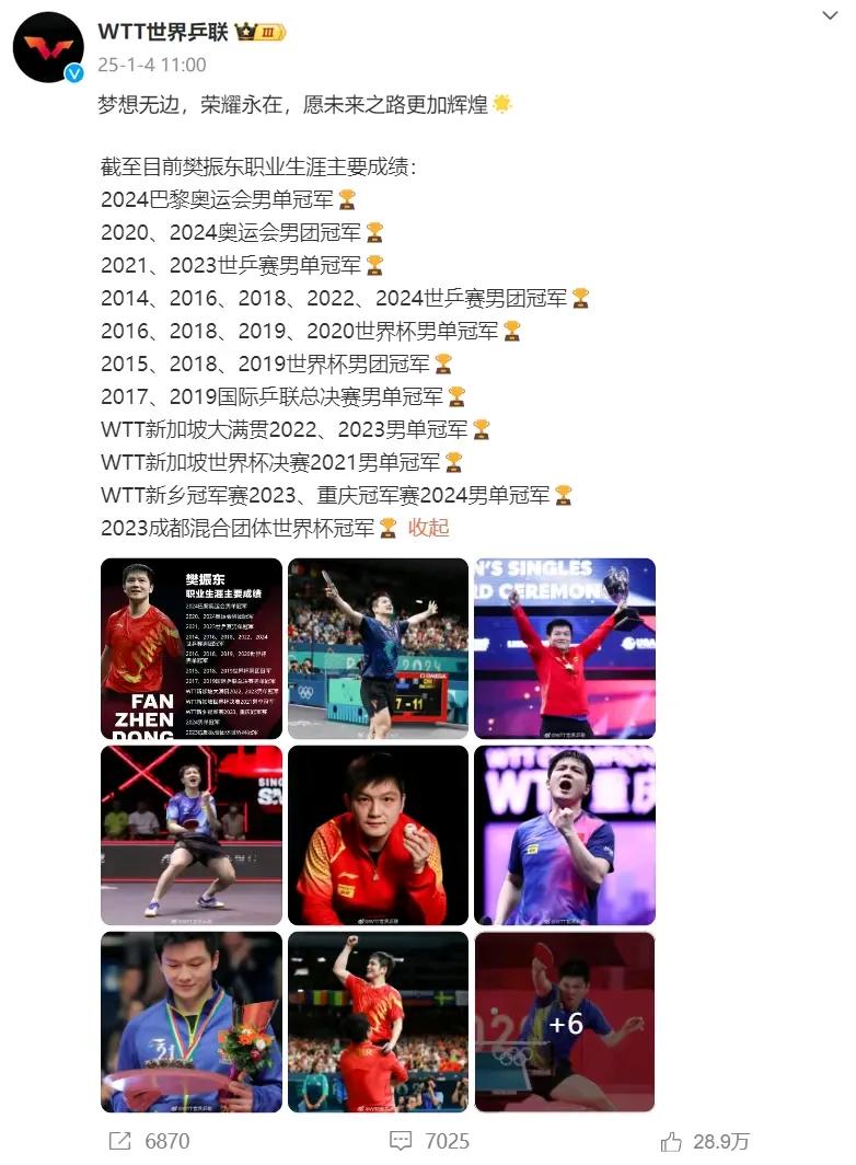 樊振东就退出排名一事做出新回应 他说不管是国际乒联,还是我们中国乒协都是想让乒乓球这个项目,能够更加国际化,对自己而言希望自己的职业生涯能更长,像波尔一样成为传奇,如果时间短相对来说就差点。 看得出樊振东舍不得赛场和热爱。这次WTT,国际乒联,中国乒协,都在第一时间做出回应,相信他们会协调好,他们也舍不得这些优秀队员。 WTT给马龙,樊振东,陈梦分别送上了新年祝福。
