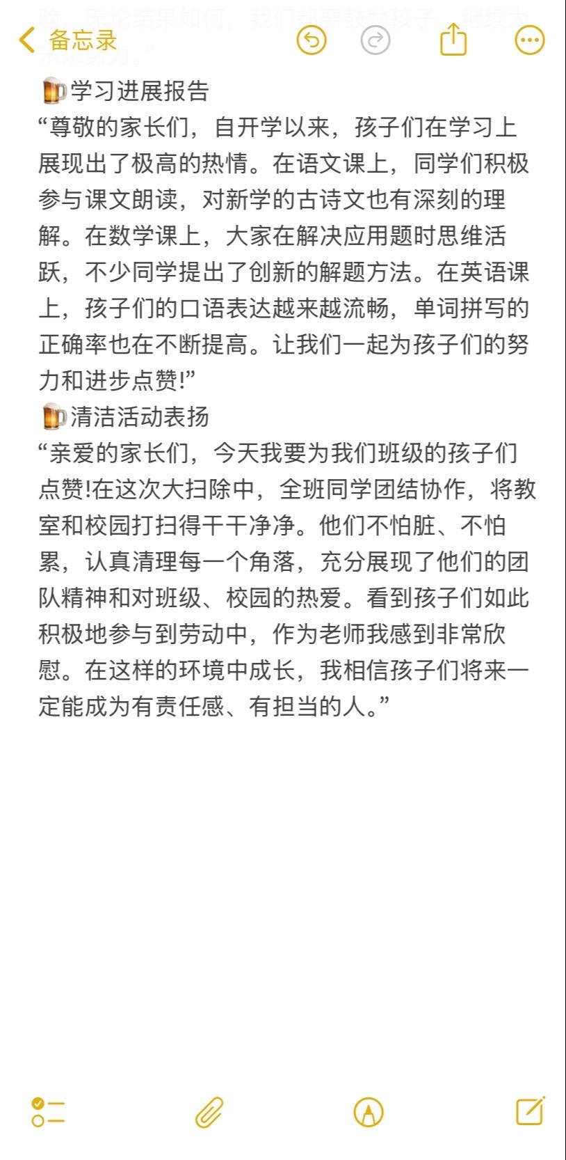 “尊敬的家长们,我在此要特别表扬我们班级的学生们。在这段时间里,全班同学在完成作业方面做得非常出色!每一份作业都字迹工整,正确率极高,大家都非常认真地对待每一项作业任务,展现出了强烈的学习责任感和进取心。这与家长们的耐心指导和孩子们的辛勤努力是分不开的,希望同学们能继续保持这种优秀的学习态度,不断在学习的道路上取得进步。”