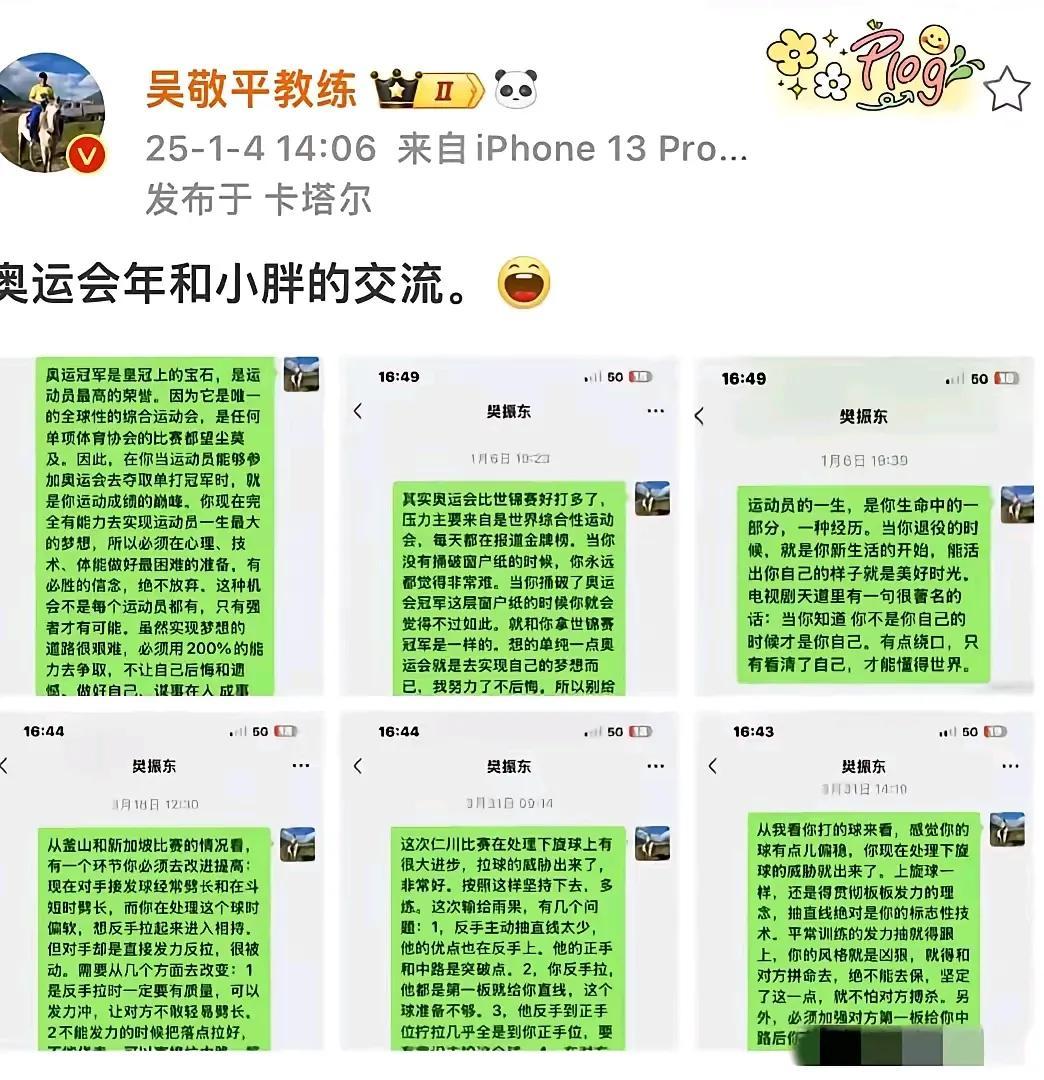 吴敬平的用意何在,频频发文,说樊振东和张继科,他们是一路人吗?发和樊振东的微信图,怎么没有樊振东本人的回话,他祝樊振东新年快乐樊振东也没回他。他这是在造谣污蔑樊振东,让樊振东的粉丝和中国乒乓球队对立,樊振东只是对WTT有意思可不是要和中国乒乓球队对立,和刘国梁王皓対立。 备站奥运会全是王皓亲目陪练樊振东,睁眼说瞎话造谣王皓不管樊振东,真是造谣不知道丢人现眼。目的何在是想当乒协主席还是想当男队主教练。
