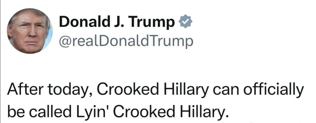 特朗普在自己的社交媒体账号上发文说:从今天开始,骗子希拉里可以正式称为撒谎的骗子