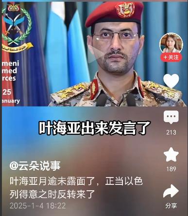 也门胡塞武装的将领叶海亚有段时间没露面了,以色列宣称叶海亚已被斩首,可让以色列打脸的是,叶海亚于1月3日又发声了。战争中的公开与私下信息真真假假、虚虚实实,其实都是套路,你不现身,又怎能被定位呢?这是以色列的一种策略。