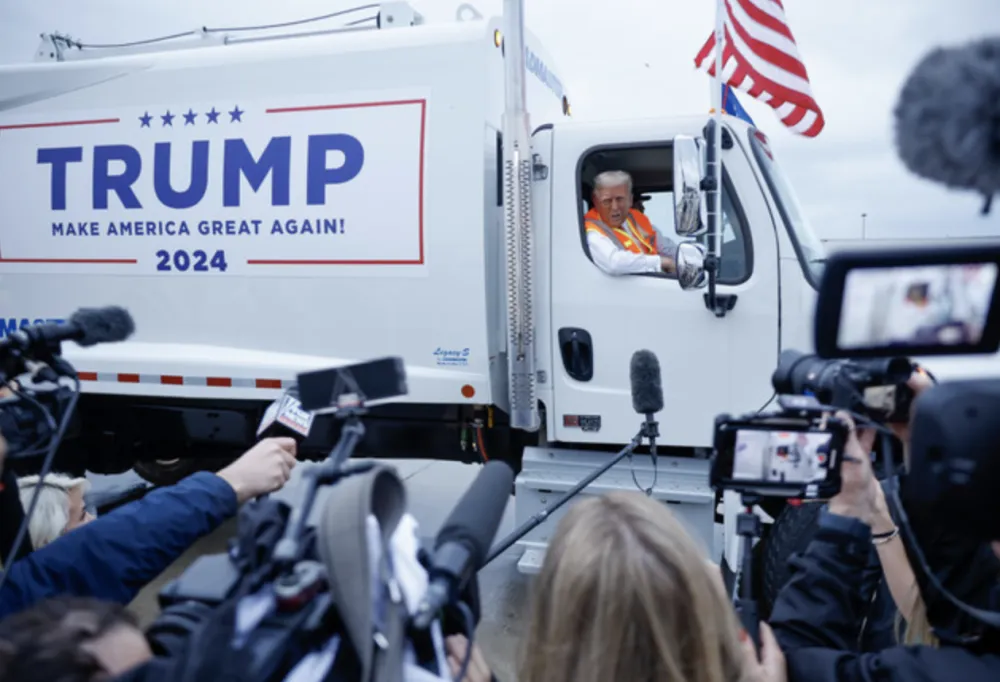 在2024年美国总统大选期间,特朗普在威斯康星州的竞选集会上上演了一出引人注目的戏码。他身穿橙色环卫工作服,乘坐一辆印有“特朗普让美国再次伟大2024”字样的白色垃圾车抵达集会现场。这一举动是为了回应拜登将特朗普支持者称为“垃圾”的争议言论。特朗普在垃圾车上对记者说:“你觉得我的垃圾车怎么样?这辆车是为了纪念卡玛拉和乔·拜登。”他在集会上强调,2.5亿美国人不是垃圾,并表示自己的支持者比拜登和哈里斯素质高得多。这一事件迅速在社交媒体上引发热议,成为大选期间的一个标志性场面。
