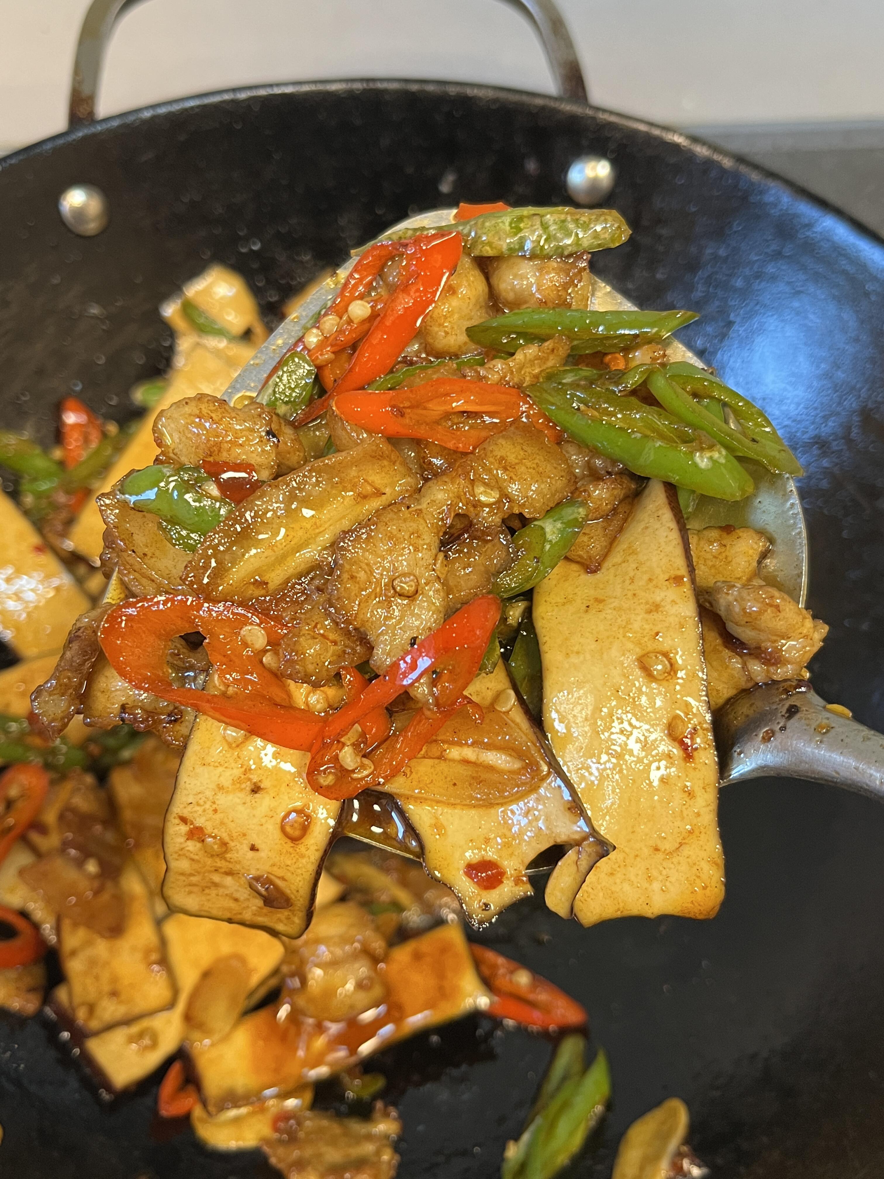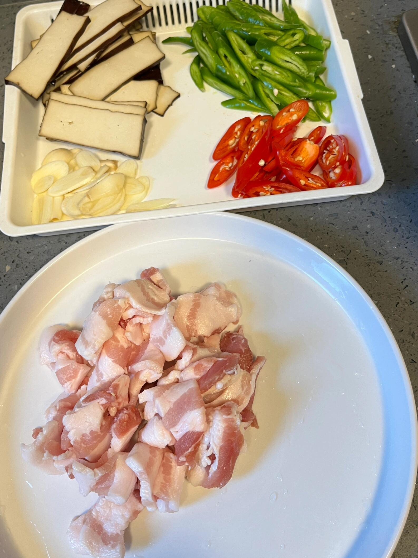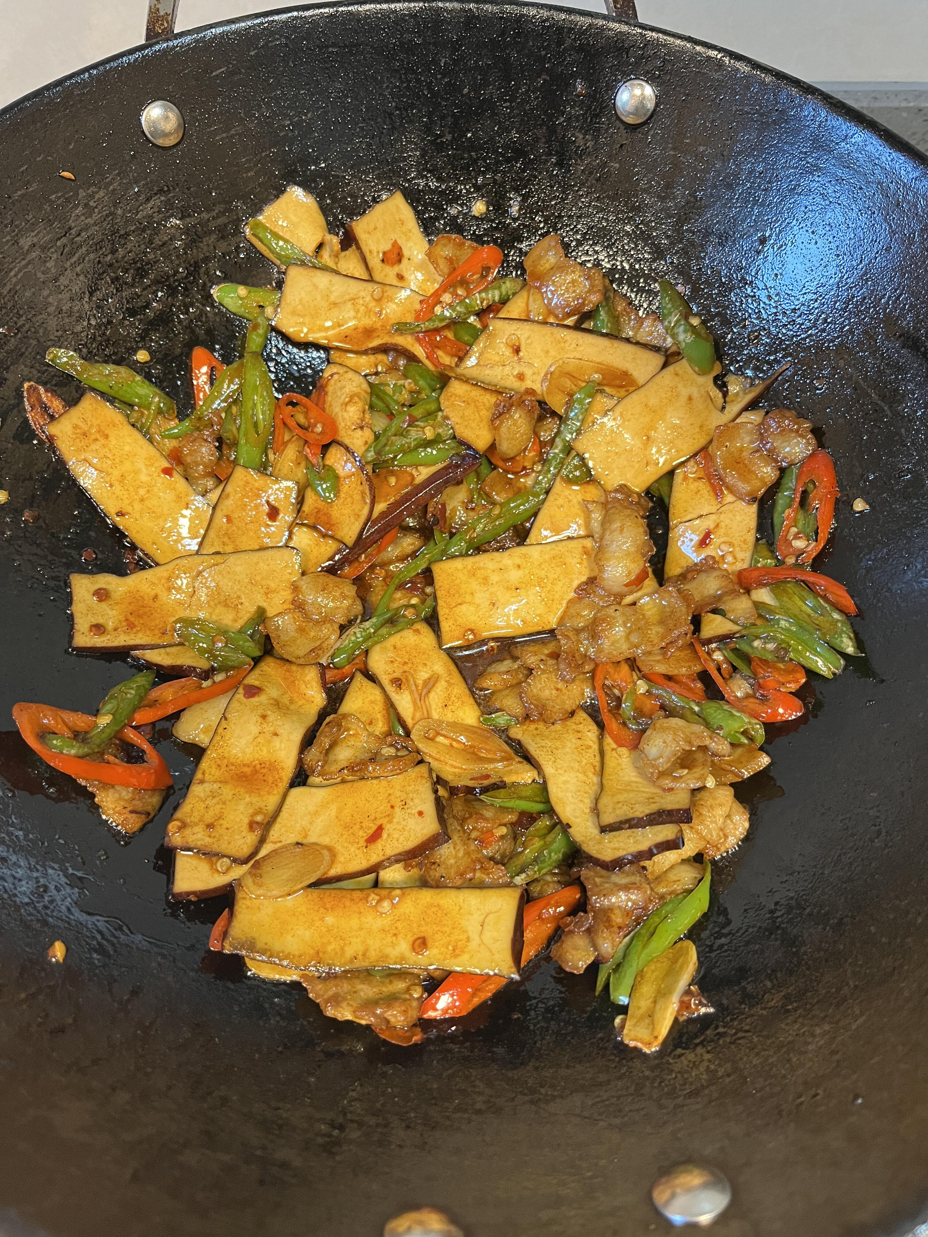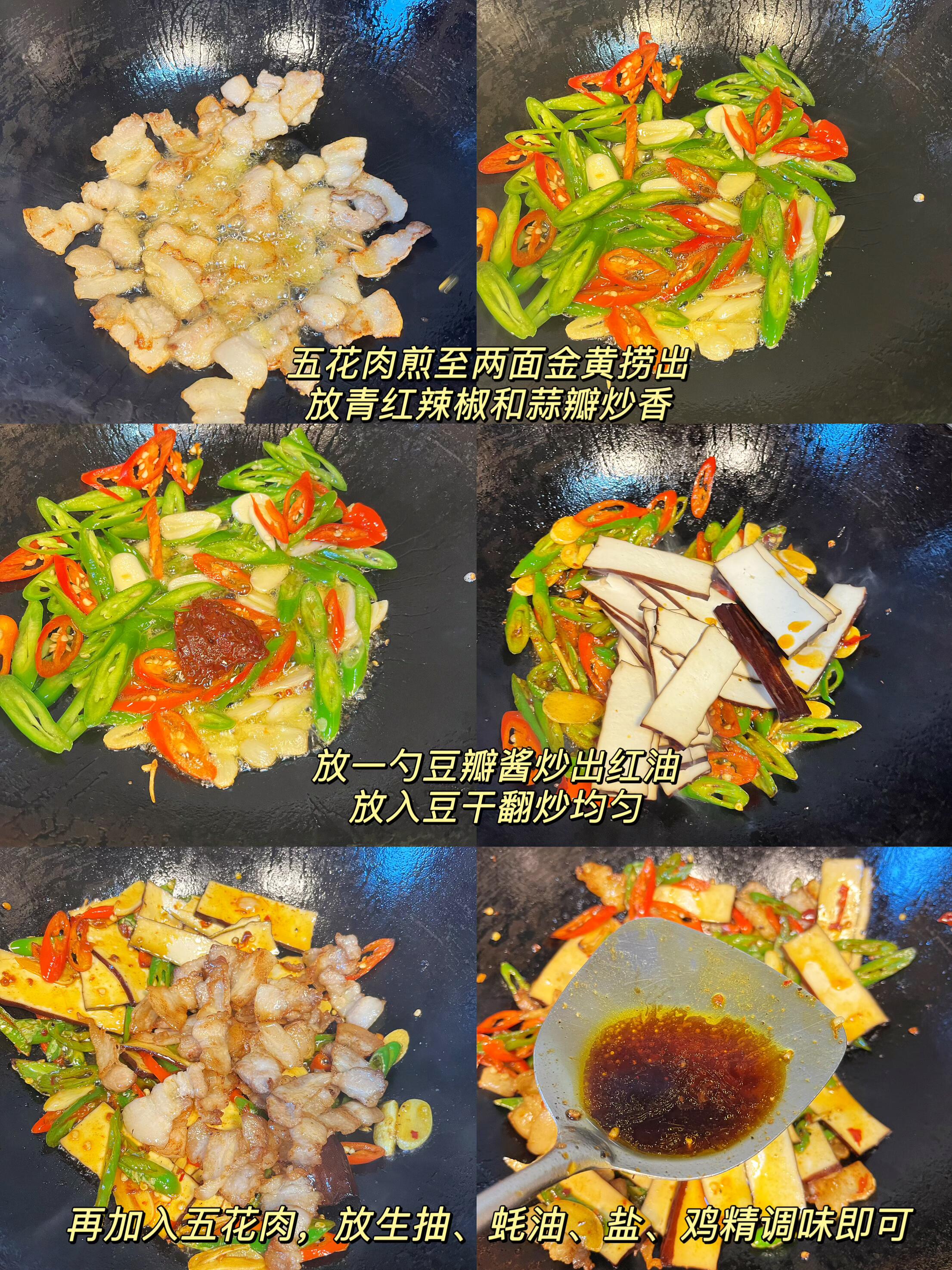 豆干辣椒炒五花肉,真的香迷糊了~ 豆干软软的很入味,五花肉干香干香的 快来试试吧~ 做法:1、五花肉去皮切片,下锅煎至两面金黄盛出 2、锅内留底油炒香辣椒,加一勺豆瓣酱炒出红油,放入豆干翻炒均匀 3、放入五花肉炒香,放生抽、蚝油、盐、鸡精调味即可