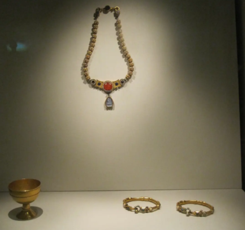 专家们在清理墓室时,发现了大量的珍贵文物,其中最引人注目的,是一条镶嵌着珍珠宝石的金项链。这条项链由金质球形链珠串联而成,上面镶嵌着青金石、鸡血石、珍珠等珍贵宝石,即使经过千年的岁月洗礼,依旧光泽明亮,鲜艳如新。