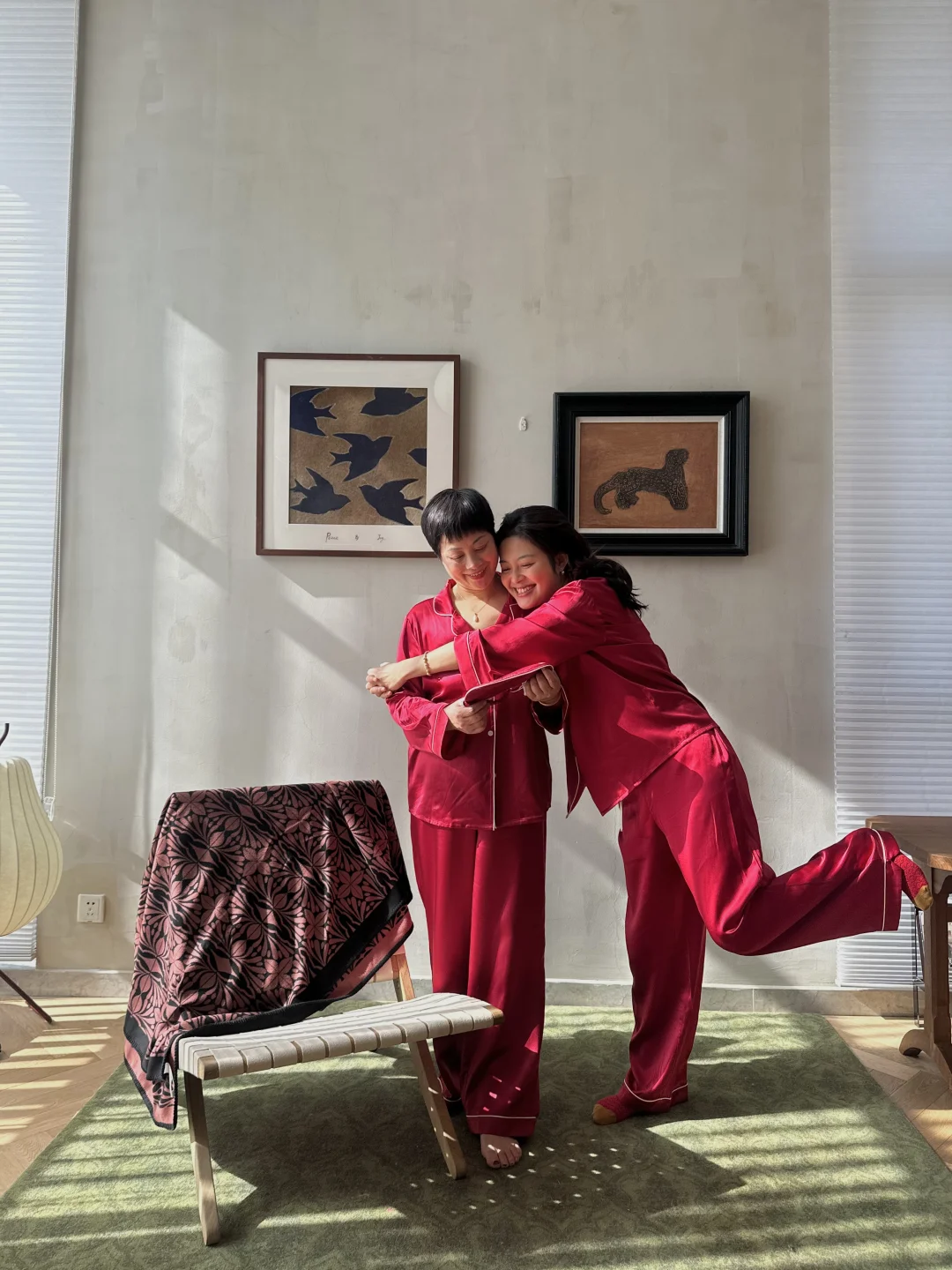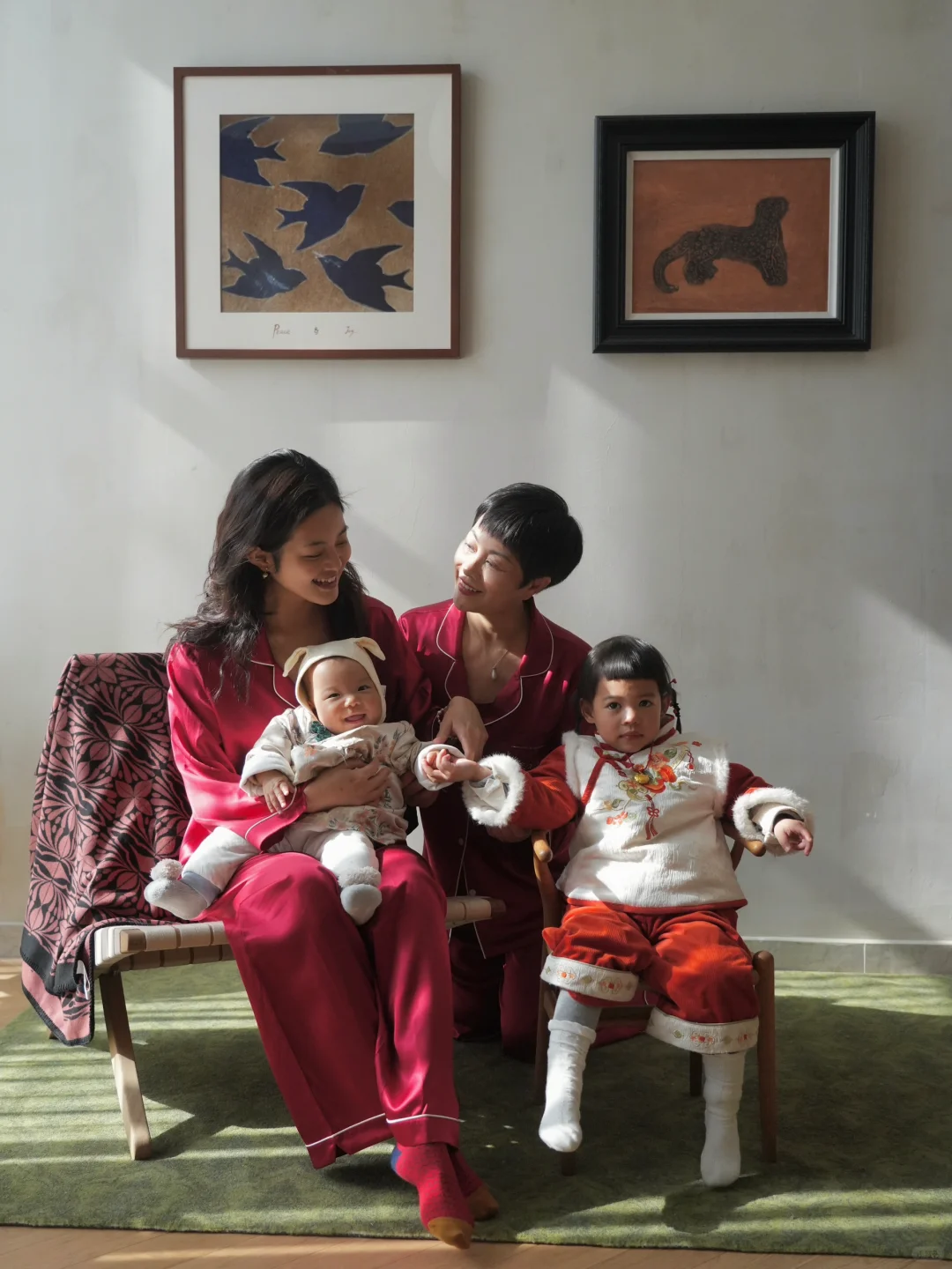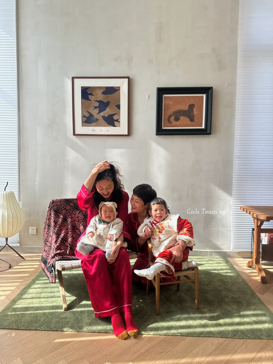于是,生日这一天,我们都换上正正红红的母女装,在家拍了一组“女子宿舍”全家福。