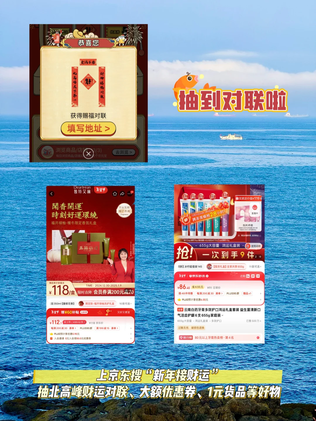 ❸上京东打「新年接财运」里面的价格💰真的蛮香 想囤年货的宝子们可去选选 我就选了独特艾琳礼盒 味道好闻 保湿滋润 送礼自用都很不错 而且里面还有优惠券🎫 1元货品等好物噢👍 我还抽中了北高峰财运对联 提升过年仪式感