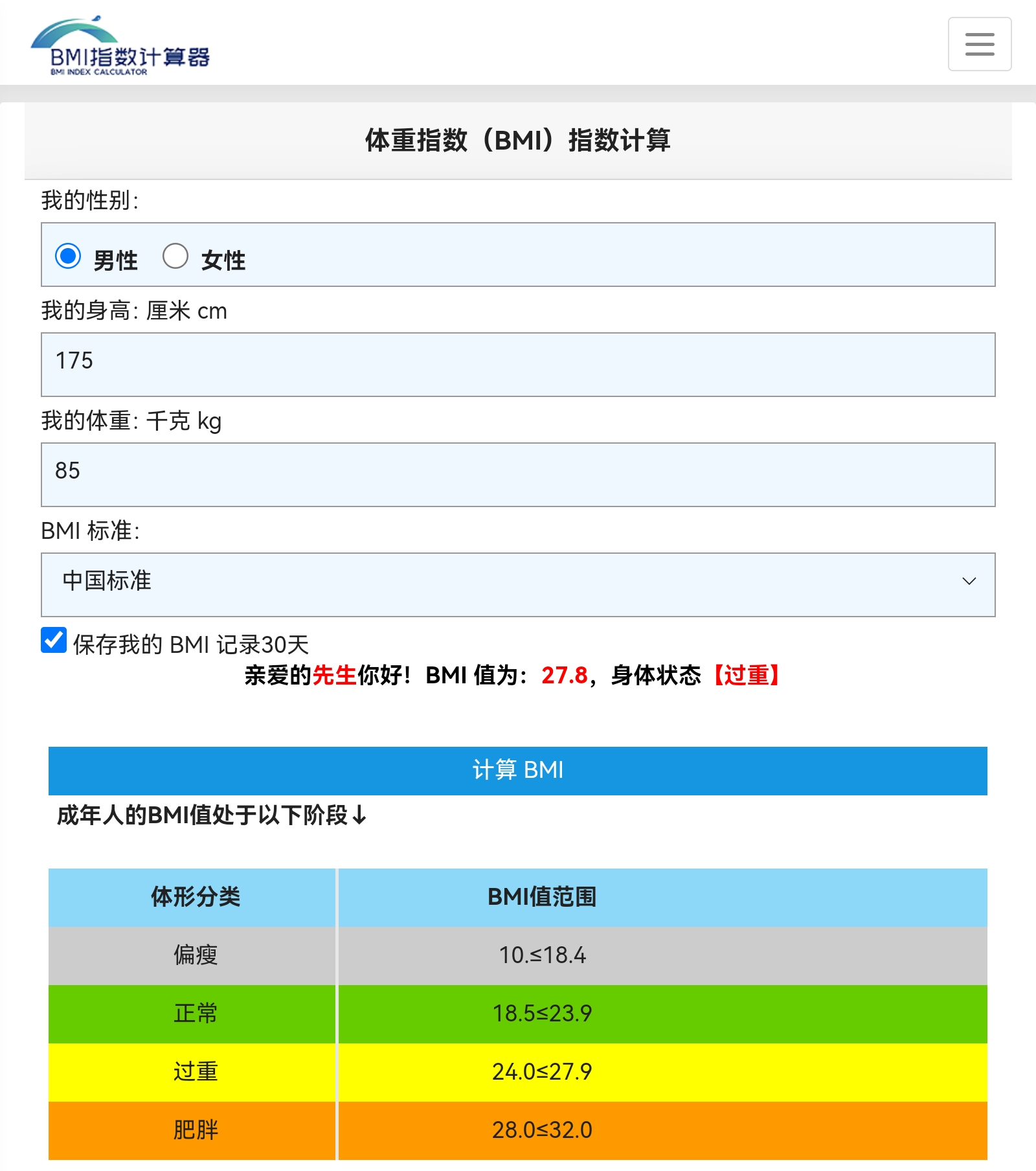 目前90公斤,想减肥到85公斤,BMI指数,还是肥胖,身高175无法增长,只能看体重了。
