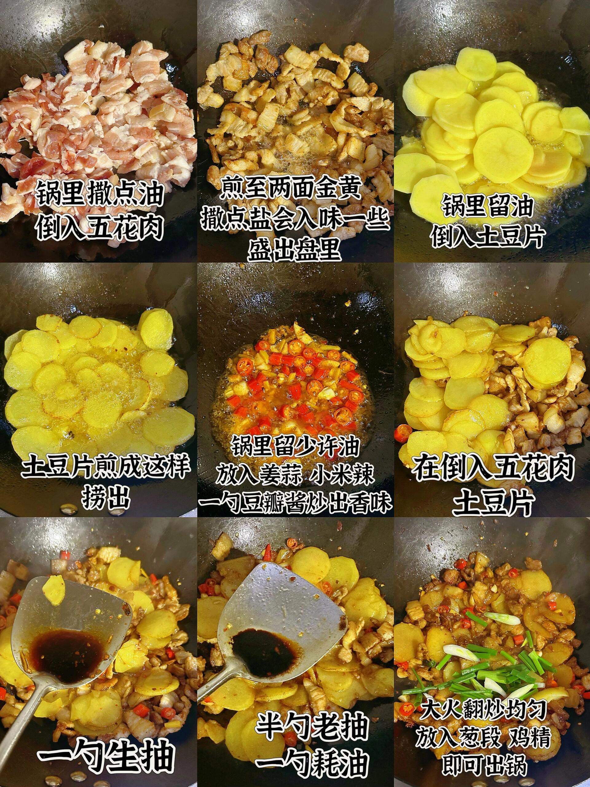 家庭版干锅土豆片炒五花 喜欢把五花肉煎的干点,然后搭配上土豆片,一道下饭又下酒的菜就做好啦!咸香的五花肉一口一个,土豆片也软糯入味,超好吃! 干锅土豆片炒五花肉 做法:1、五花肉买回来,可以先烧一下皮,清洗干净,切成薄片。土豆也成大小均匀的薄片。姜蒜,小米辣切好备用。 2、锅里人点底油,倒入五花,等五花肉煎出多余的油脂,两面金黄的那种,捞出盛盘里。锅里留油,在倒入土豆片,煎成两面金黄变软,也捞出盛出盘里。 3、锅里留少许油,放入姜蒜小米辣,一勺豆瓣酱炒出香味后,倒入五花肉和土豆片,翻炒均匀后,加入一勺生抽,半勺老抽,一勺耗油,少许盐,继续翻炒一分钟左右,放入葱段,鸡精即可出锅!