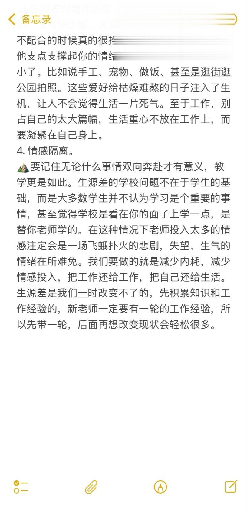 ⛰️越来越发现,越是生源差就越要多夸奖,批评打压只会让情况越来越糟,而且班里也会有很多同学自我放弃,这种情况下别太纠结,抓大放小,抓住整体愿意学的就行,眼睛多盯着表现好的,表现差的只要不扰乱纪律什么都好说,就算捣乱了也是一带而过,争取春风满面的上课,开开心心的下课。而且我发现这样一来学生也更开心更积极了,不得不说真的得哄着学。(生源越差学生心理越脆弱……)一句话,我们要为愿意学的孩子负责!别花太多时间精力在不值得的人身上!