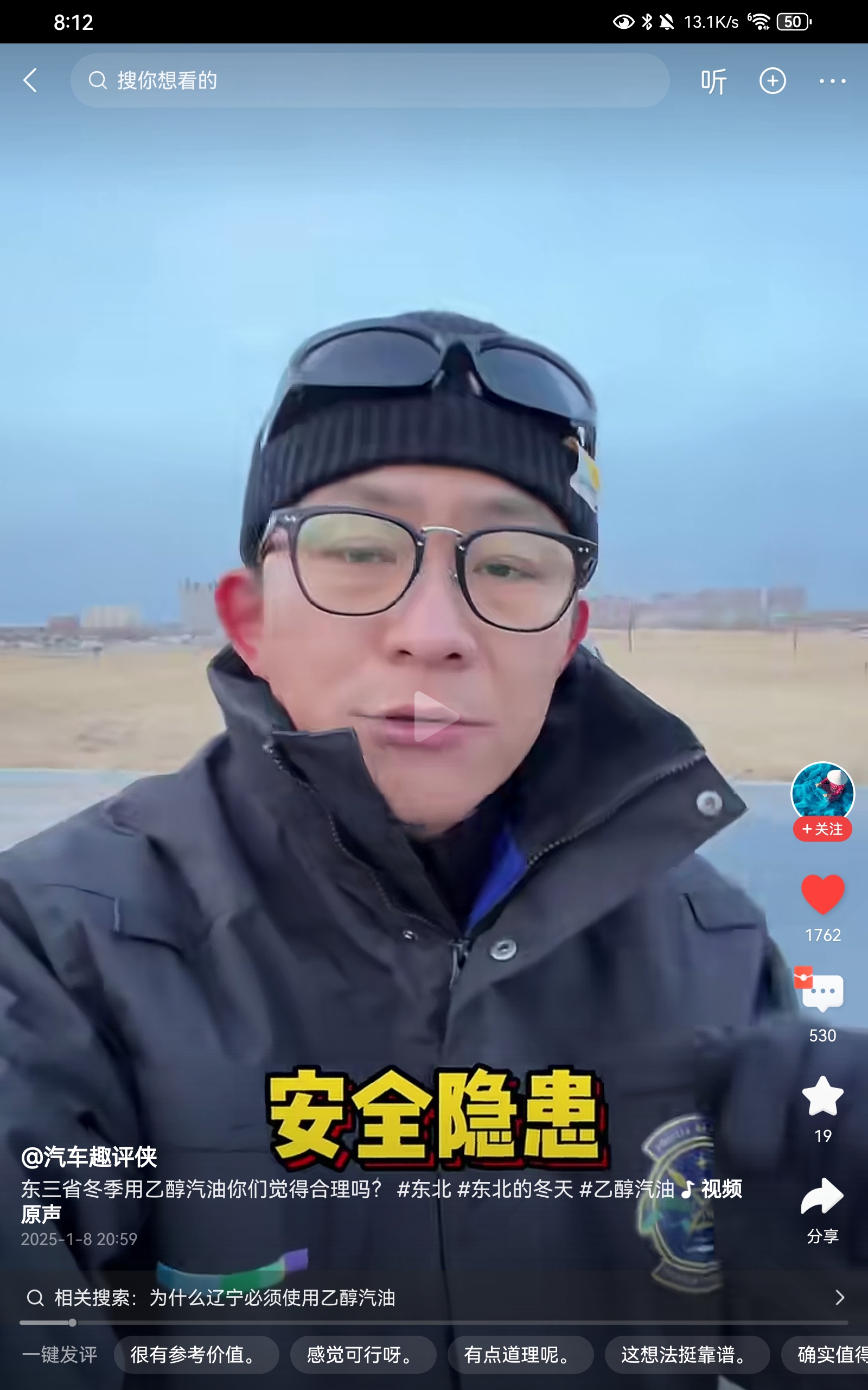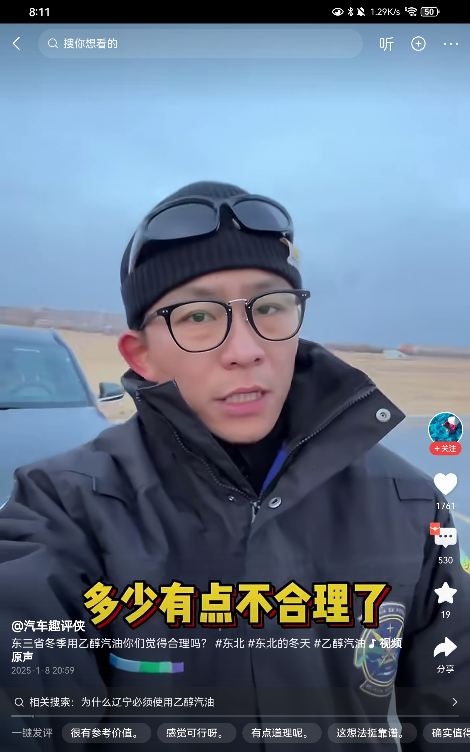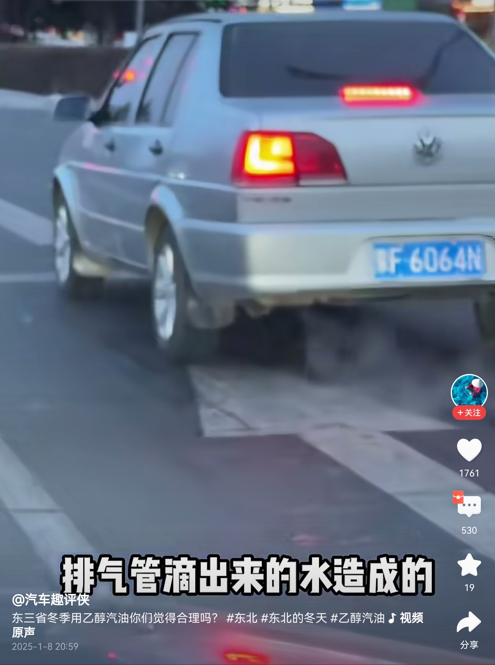 有些汽车博主有点意思,对乙醇汽油下手了,因为排气管滴水,结冰了。要是这么说,那老天爷最不合理了,因为下雪呀,祸害东北人类几千年了。撒尿滴答几滴到台阶上,撒尿就不合理了,是这个意思吗?有点吹毛求疵了。