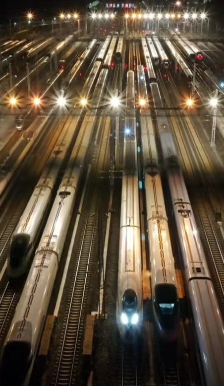 这群陆地航母正是我们的一艘艘高铁。 看着他们启航的样子, 震撼力杠杠的!