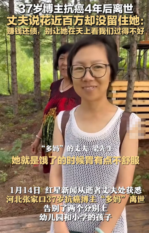 而这个坚强的女性,便是抗癌博主“多妈”! 坚持抗癌4年的她,没有向命运屈服,但终究还是被命运夺去了生命。 而她的家庭也为了治疗她,花费了百万元。 家里拼命地想要留住她,但无奈的是,当死亡来临的那一刻,没人挡得住。 根据《红星新闻》2025年1月15日的消息 在她离世之后,多妈的丈夫说:“虽然他已经离开了自己,因为治病欠的钱还要继续还下去。” 丈夫不想让逝去的妻子看到,自己的家庭在她走后,变得一片暗淡。 这段时间,网上接连出现了抗癌博主离开的消息! 比如湘妹子阿妹、 比如一只羊咩, 等等,他们都是非常优秀的人,但是碍于身体的情况,不得不离开这个世界。 她们非常努力地活着,以为坚持下来就有希望。 但奈何,以现在的医疗条件,她们抗癌终是失败了。 她们能做到的,只有乐观地面对一切,积极治疗,把自己对生命的乐观,传递给他人。 看完他们的故事,可能真的也解析不出什么,唯一能说的: 愿这些坚强的人,在另一个世界安好,没有疾病的折磨,没有亲人离散的遗憾。