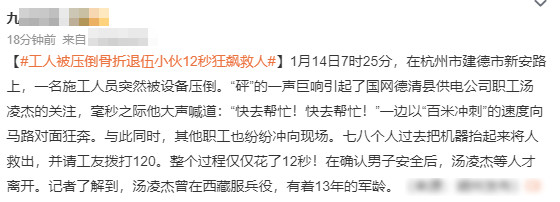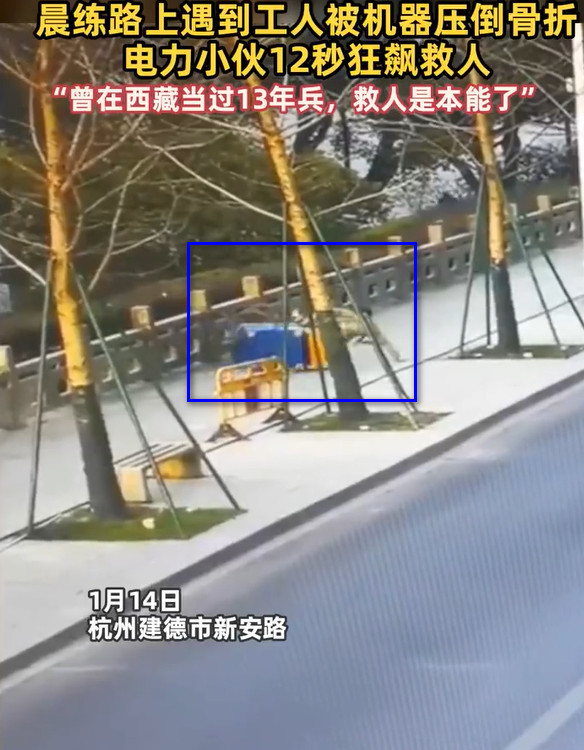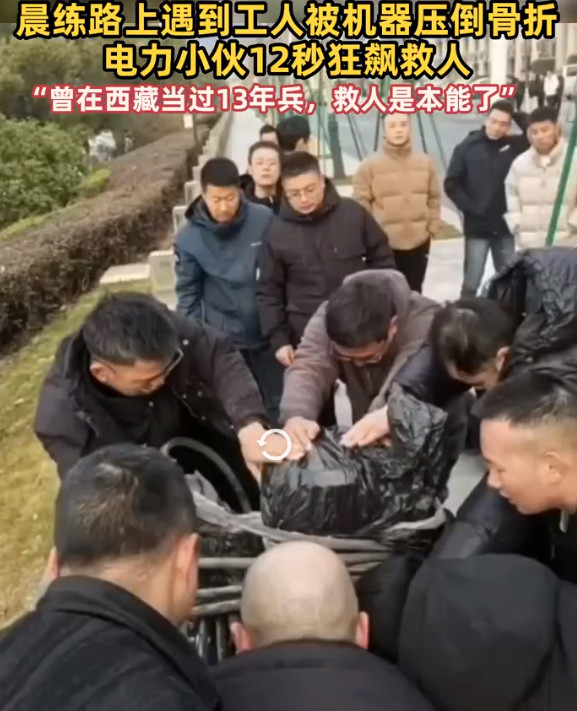 某电力公司的一名小伙儿正在晨练,突然看到一个施工工人在路上被机器砸倒。 此时的他在毫秒级的时间内,做出了最快速的反应,“快去帮忙!” 然后冲了过去。 而此时闻声而来的其他人,纷纷看到被砸工人的情况,齐齐冲上前去,仅仅12秒的时间,将工人从机器中给移了出来。 如果不是他的大声呼喊,大家没有迅速赶到现场,可能工人还会遇到其他的危险。 因为仅仅就在那片刻之间,工人的腿便已经被机器给砸到骨折了。 根据《九派新闻》2025年1月16日的消息 工人被救后,有人安抚他的情绪;有的帮他止血;还有的人打120报警。 而这位小伙在确认工人基本获得安全之后,便匆忙离开了事发现场,回到了自己的工作当中。 其实小伙还有另一个身份,他是一名退伍士兵。 这种正能量的事迹,需要我们一起为他传播,让更多的人知道这些无名的英雄。 不仅小伙是英雄,此次加入救援的人,都是英雄。