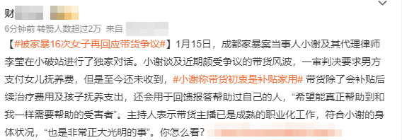 最关键的是,上次的判决,小谢也意识到了自己未来将会处在非常大的危险中。 根据《财经杂志》2025年1月16日的消息 在小谢的印象中,自己的前夫是一个报复心极强的人。 一旦对方出狱,恐怕自己又会迎来一次暗淡的时光。 距离前夫出狱的时间,只有仅仅9年,所以这段时间他必须攒足每一分钱,挣够足够的钱以便面对未来可能发生的灾难。 她不想再坐以待毙,她不想再被自己的前夫凌辱。 其实,那些质疑他的网友也应该理解一下。 小谢的确是靠着网络热度,让自己的丈夫受到了应有的惩罚。 但不可否认的是,她因为丈夫对她的摧残,已经让她基本上丧失了重新找工作的能力。 如今最简单、挣钱最容易的方式,也不过就是直播带货。 如果连直播带货都做不到,很可能他连找个工作混口饭吃的机会都没有。 那么她的治疗费用以及女儿的抚养费用都将成为一场空谈。 个人觉得,任何人都有直播带货的权利。 只要人家直播带货带的东西是好物,品质有保证,这也是靠本事吃饭,甚至也是卖力气吃饭,没什么值得大家质疑的。 每个人都有活下去的权利,也有想活得更好的权利,也许我们不赞同,但可以包容。