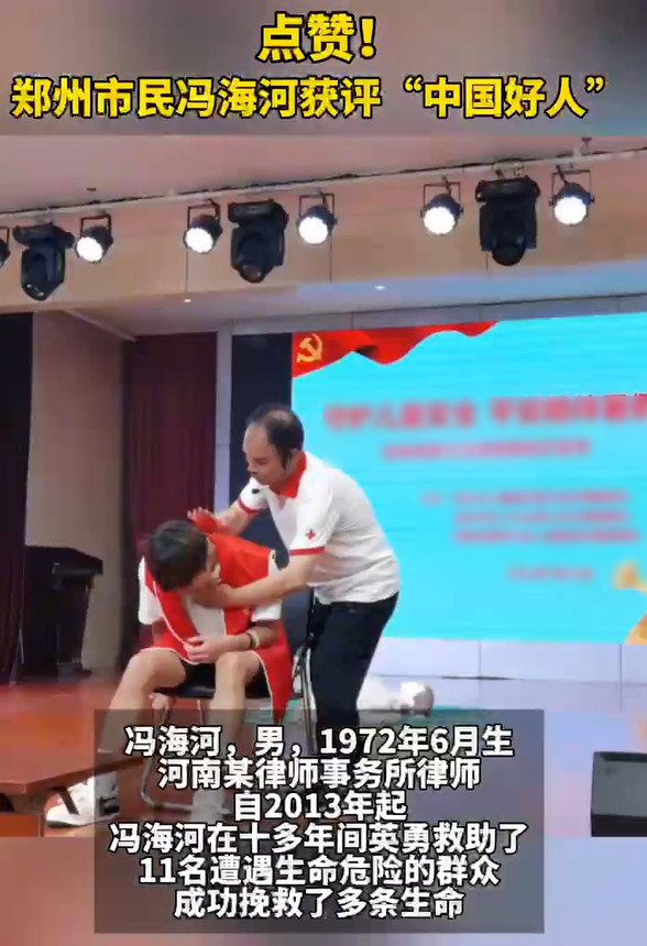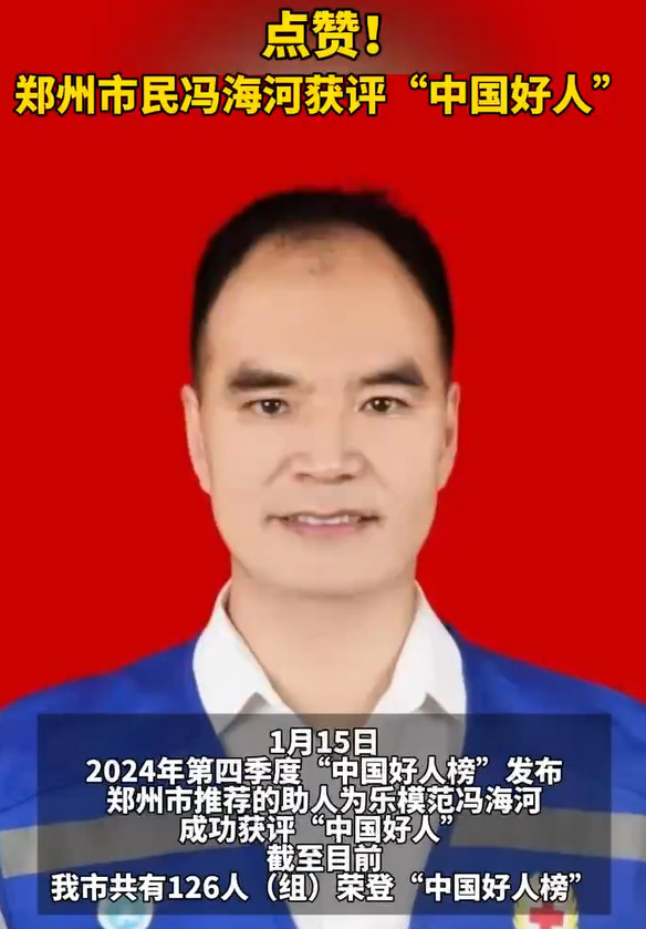 但是他在工作之余,还做了很多帮助他人的事情,仅他一个人就曾经救助过十一名遇到危险的群众。 而为了教会大家更多的急救知识,他还特地与志同道合的一批人组建了一个团队,进行各种急救知识的宣讲。 而他这个团队的受众已经高达12万人。 根据《郑州日报》2025年1月16日的消息 因为他的出色表现、以及乐于助人的精神,所以他被评为“郑州好人”,同时他还上了“中国好人榜”,成了中国好人。 而这次“中国好人”的评选,正是对他过往行为的肯定。 大家不知道的是,在郑州市一共有136位像冯海河这样的好人,他们都受封过“中国好人”。 我们很多人都在说,现在社会越来越冷漠。 如果在路上,有人摔倒,旁边的人,大概率会为了避险,躲得远远的。 事实上,很多英雄,在救人的时候,从没有避讳这些麻烦。 因为救人,在自己眼里最重要,其他的可以稍后解决。 这个世界,是越来越温暖更好,还是越来越冷漠更好呢? 肯定是好人越来越多,善良的人越来越多更好。 这样的人多了,社会才会形成一个更加良善的风气,大家生活的环境才能越来越舒适。 当我们的社会出现更多像冯海河这样的人,大家一起携手,让生活的环境越来越好!