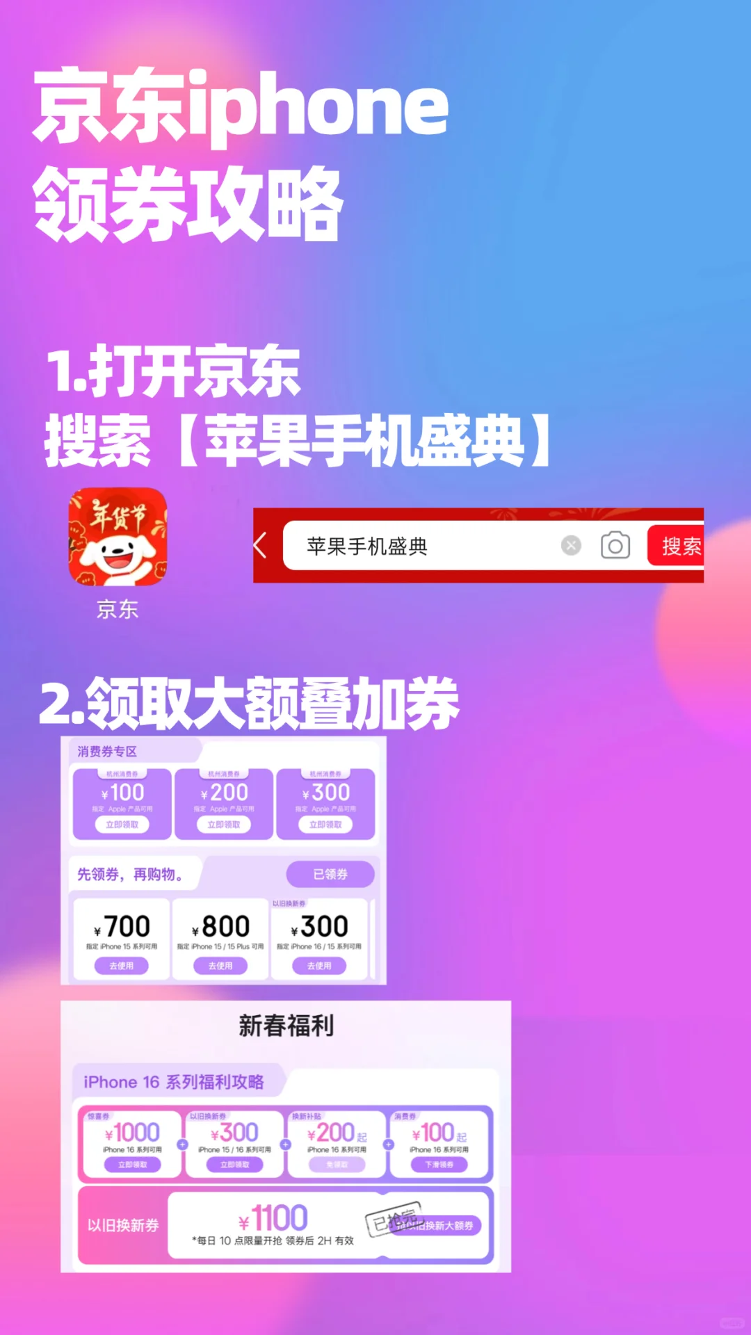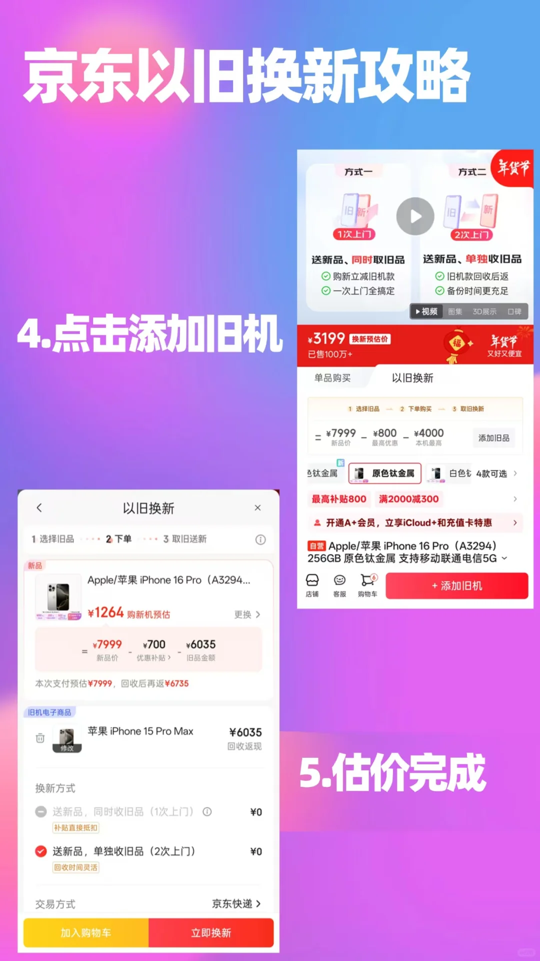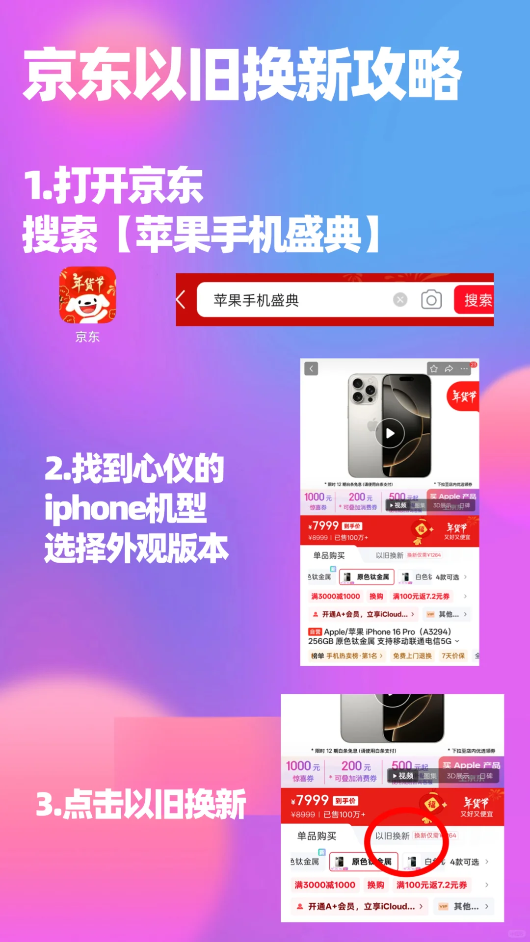 打开京东APP→主页搜索【苹果手机盛典】,进入会场→领取优惠券→选择心仪的iphone机型/外观版本→点击选择以旧换新→填写旧机机型→评估完成。