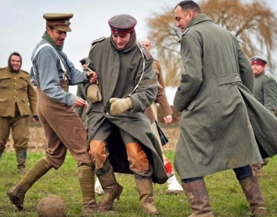 当双方士兵终于面对面站在一起时,眼中的敌意渐渐消散,他们开始互相交流,分享食物,交换纪念品,甚至还一起踢起了足球。