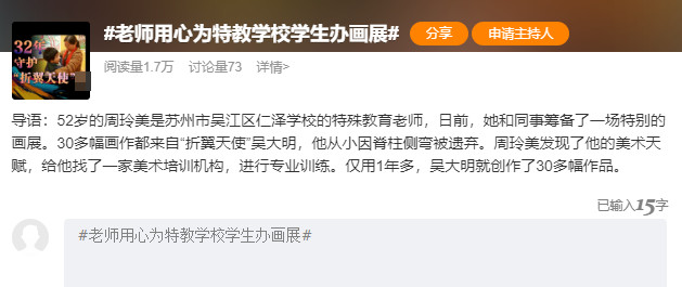 最近她又做了一件大事,帮助自己的一个学生吴大明开了一次画展。 周玲美老师在刚开始接触吴大明这个孩子的时候,这个孩子因为脊柱侧弯被遗弃了。 但是在他学校里,周玲美却意外发现,吴大明有一个非常重要的天赋——画画。 根据《都市频道》近日的消息! 周玲美老师看见吴大明的第一个画作是一个logo,这个图画立刻引起了周玲美老师的注意。 她觉得这个孩子有进一步挖掘的潜力,所以便将他送到了一个美术学校学习专业的美术。 当送去的机构得知吴大明的情况之后,竟然愿意免费培育这个孩子。 而在此之后,这个孩子学了一年的画,画技大涨。 如今这个孩子的画,已经逐渐成型,不仅让美术老师赞叹,而且周玲美也觉得以这孩子的实力足以开一个画展。 画展上的画,画得非常棒。 周玲美老师说,她想将自己这里接受特殊教育的孩子,称之为折翼的天使。 也许他们往上走的路已经不通了,也许这群孩子在困境中挣扎,但是哪怕在困境中,她也要做那个挖井人。 既然上面的道路打不通,那便由她为孩子们从下面打出一条通道,让他们走下去。 故事看到这里的你们,如果有意的话,请为这个伟大的老师点个赞,她很善良,也很伟大。