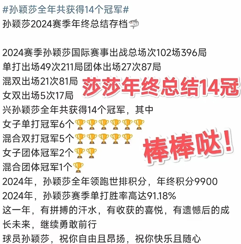 为何这样?孙颖莎在2024年的成绩虽然相当炸裂,但不如陈梦。