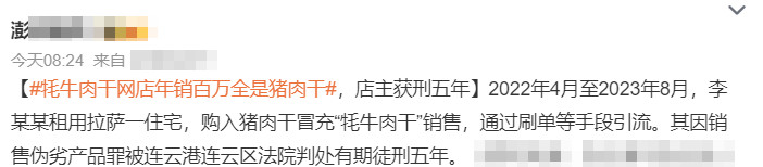 因为近日西藏一个商家卖假货的事件被曝光了出来! 就是连云港的一名市民,通过网店上购买了来自西藏的牦牛肉干。 买回家之后,尝了几口,便觉察到味道不对,受到欺骗的他,报案了。 紧接着,相关部门对涉案的这批牦牛肉干进行了检查,发现一个惊人的真相: 这个商家所售的牦牛肉干,并不是牦牛肉,而是猪肉冒充的。 根据《澎湃新闻》近日的消息! 往上追查的时候,又有发现,制作假牦牛肉干的生产厂家李某某,本不是当地了人,为了伪装成西藏的货源,便拉萨租了一间屋,专门兜售假牦牛肉干等零食。 而就是这样一个卖假货的店铺,年销售额过百万! 最终,李某某的违法行为,被判了5年的有期徒刑。 看完这个故事,最让人触目惊心的是,李某某用的是猪肉顶替的牦牛肉。 咱们如果往坏处想,我们所买的各种牛肉干、牛肉粒,甚至猪肉脯等,如果商家都用了特殊材料加工而成。 那么,我们贪便宜买的各种零食,隐藏的问题,就大了。 大家在网上购买各种零食的时候,一定要注意,尽量不要挑那些无资质的小店铺购买,哪怕买贵一点的,也要挑选正规厂商购买,以保证物品的质量。 吃的东西,一定不能大意,现在到医院的病人,都是千奇百怪的病,有些病,难保不是因为吃的东西有问题,才导致的祸患。 大家觉得对吗?