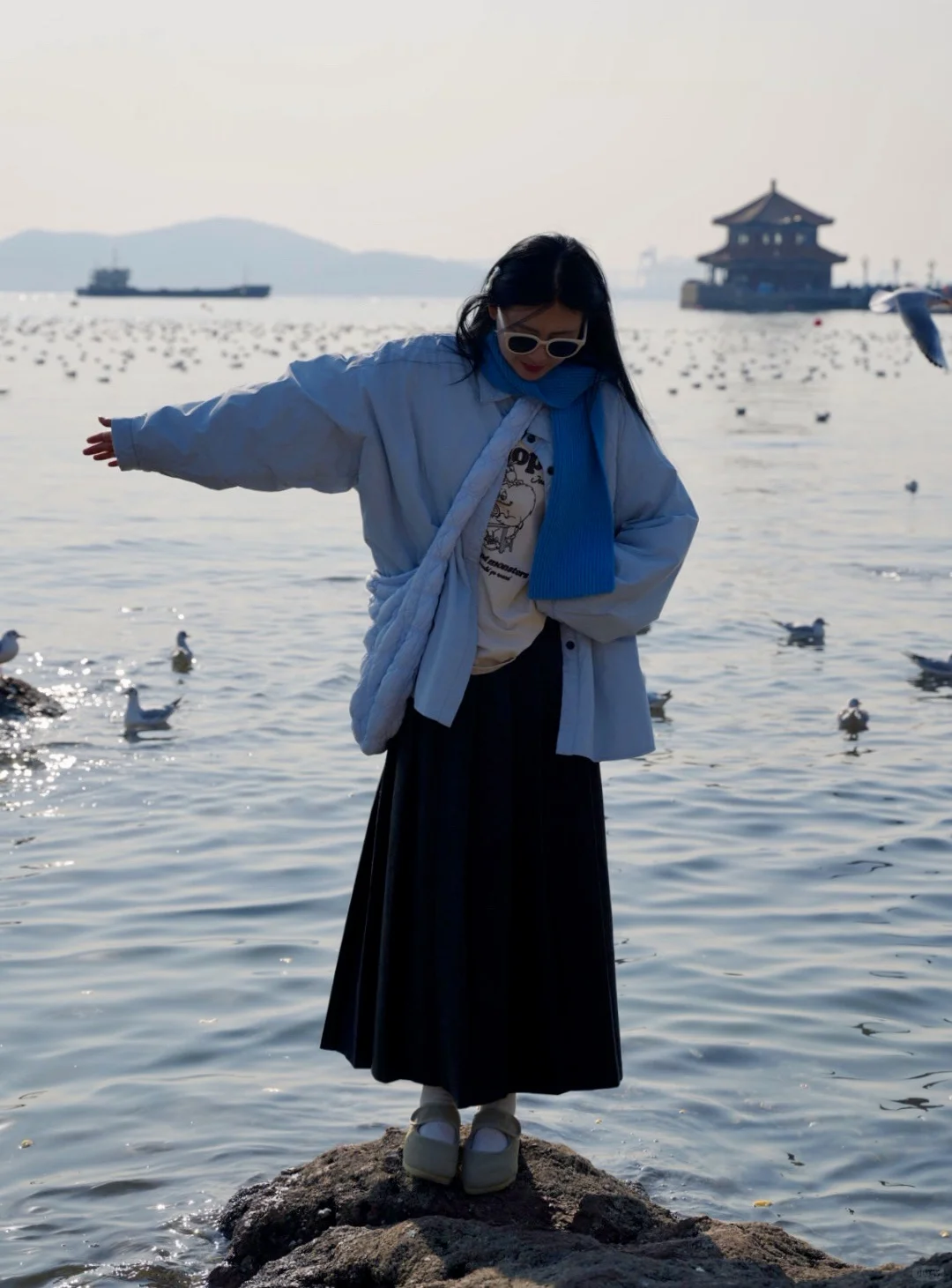 5⃣浅色衣服和大海蓝天海鸥更配哦~帽子 围巾都安排上 海边风大很冷!