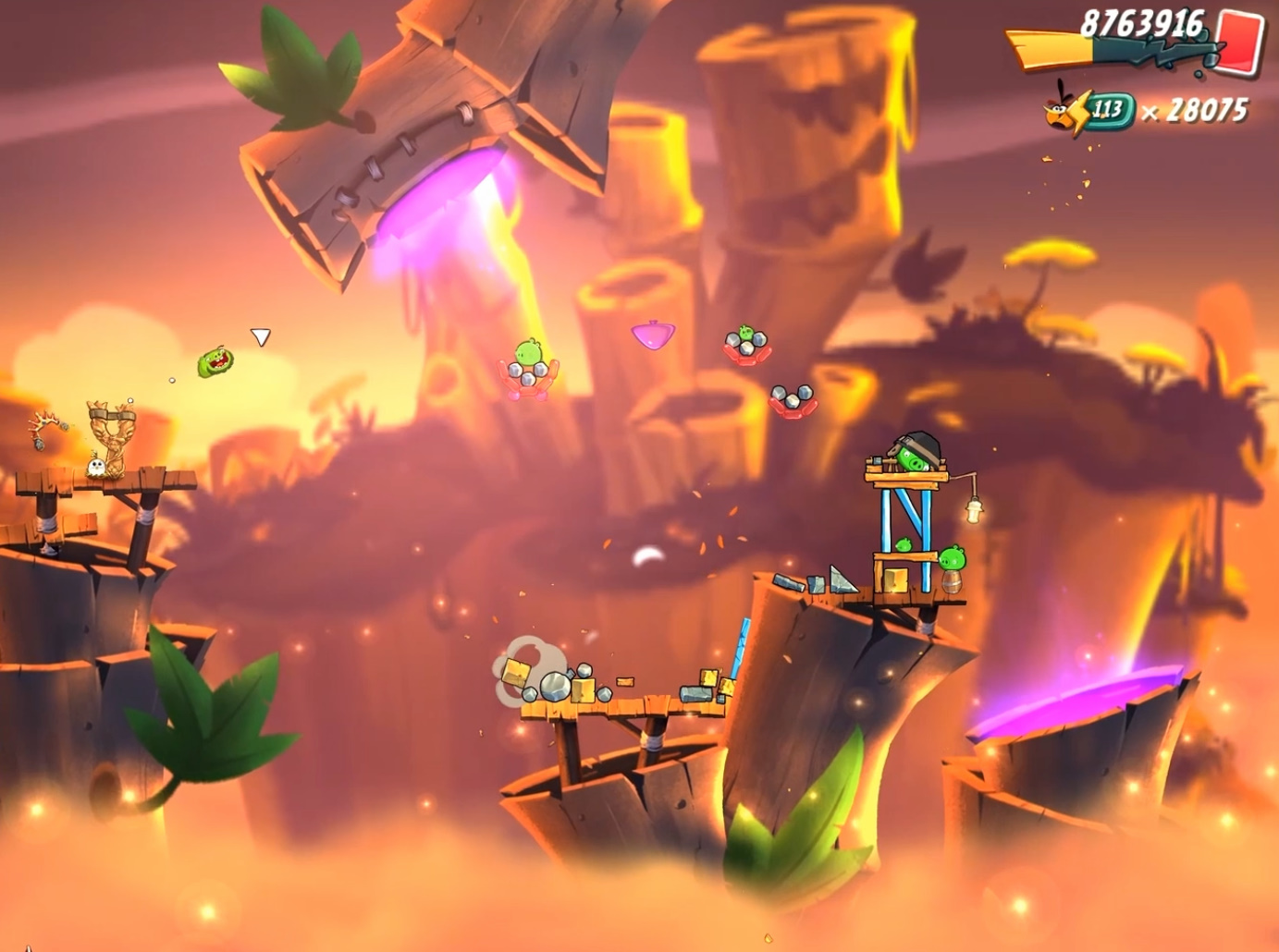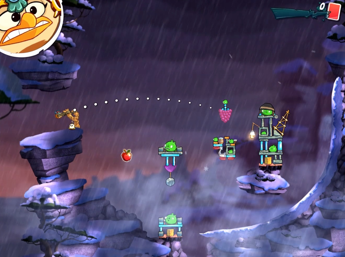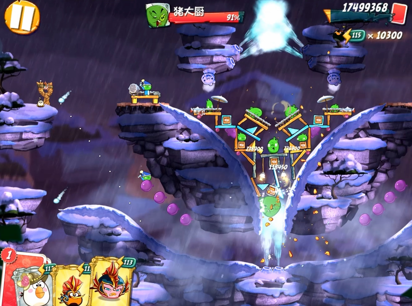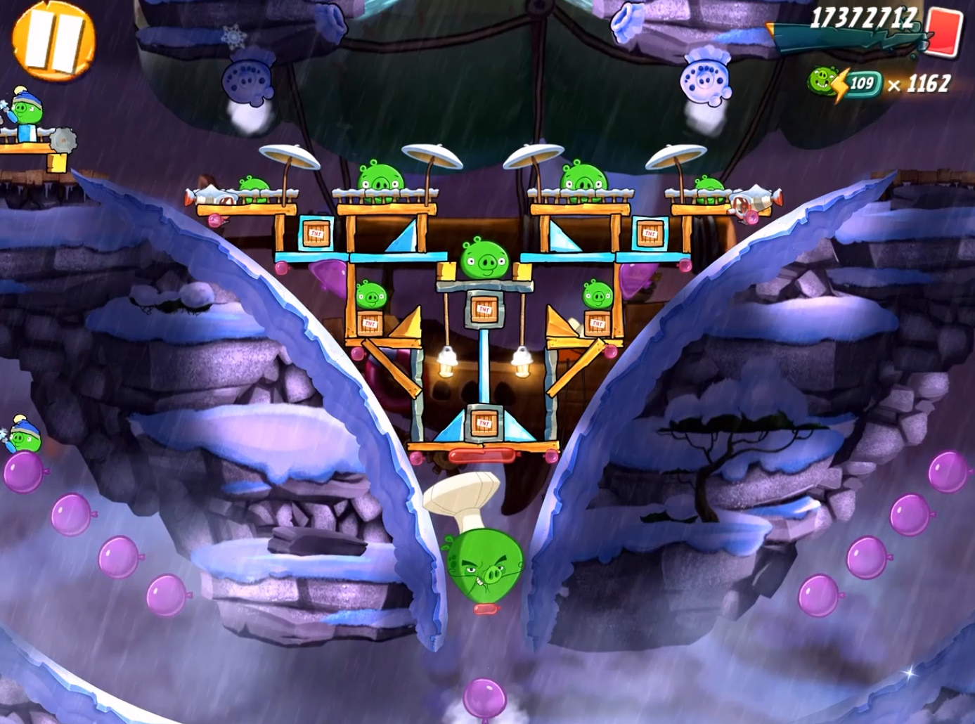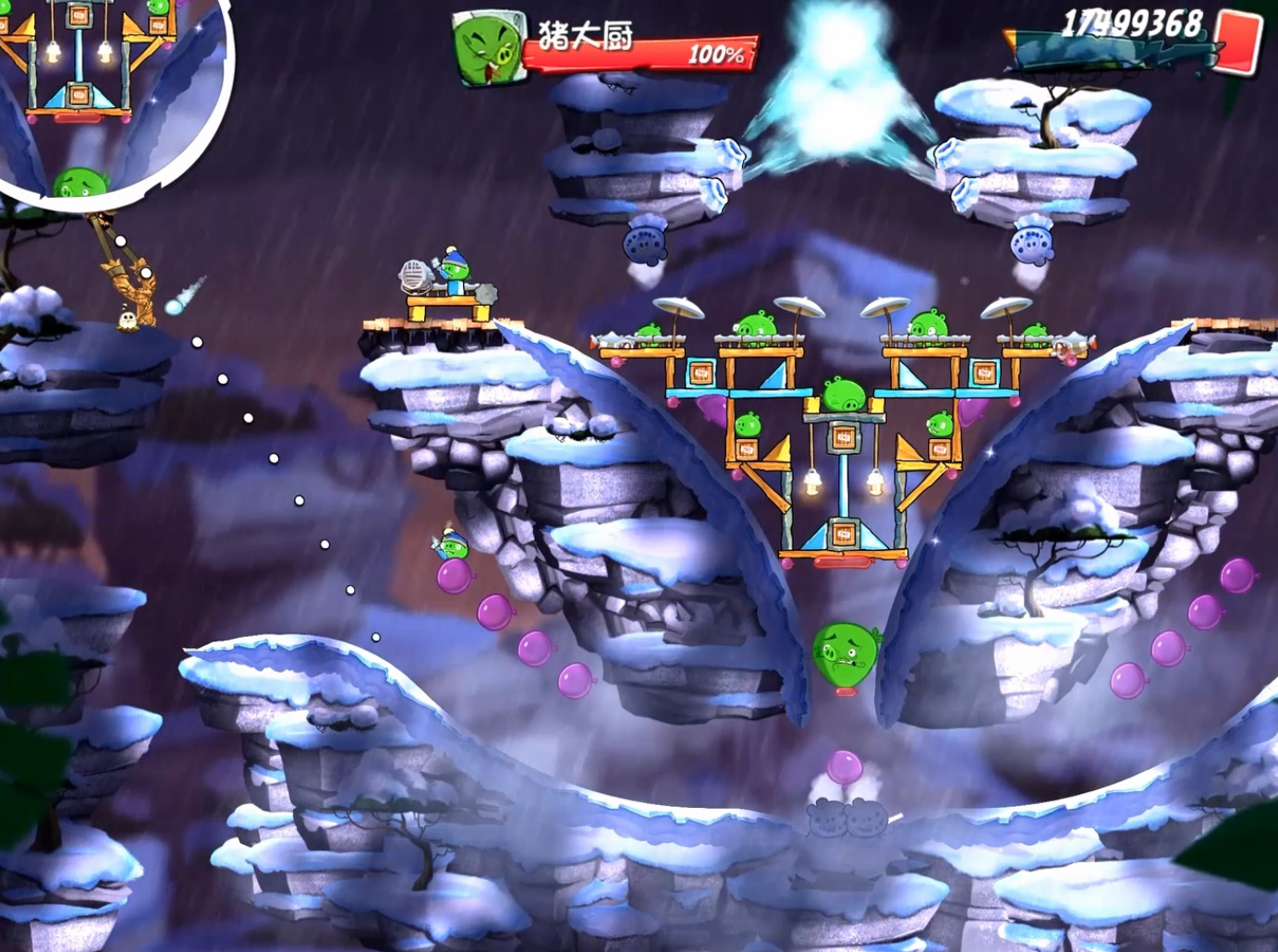 这期游戏里的小猪在气球上建造房子,这是一种非常奇怪的建筑,说它不结实,它可以抵挡泡泡类技能的攻击,例如小金鸭子魔法、泡泡橙的攻击;说这种建筑结实,它有个致命的缺点就是地基不稳。这期BOSS猪站在气球上,旁边是雪山喷泉。我们有2条思路过关,第1条思路是打破气球建筑和BOSS猪掉下去,第2条思路是让喷泉给BOSS吹到天上。