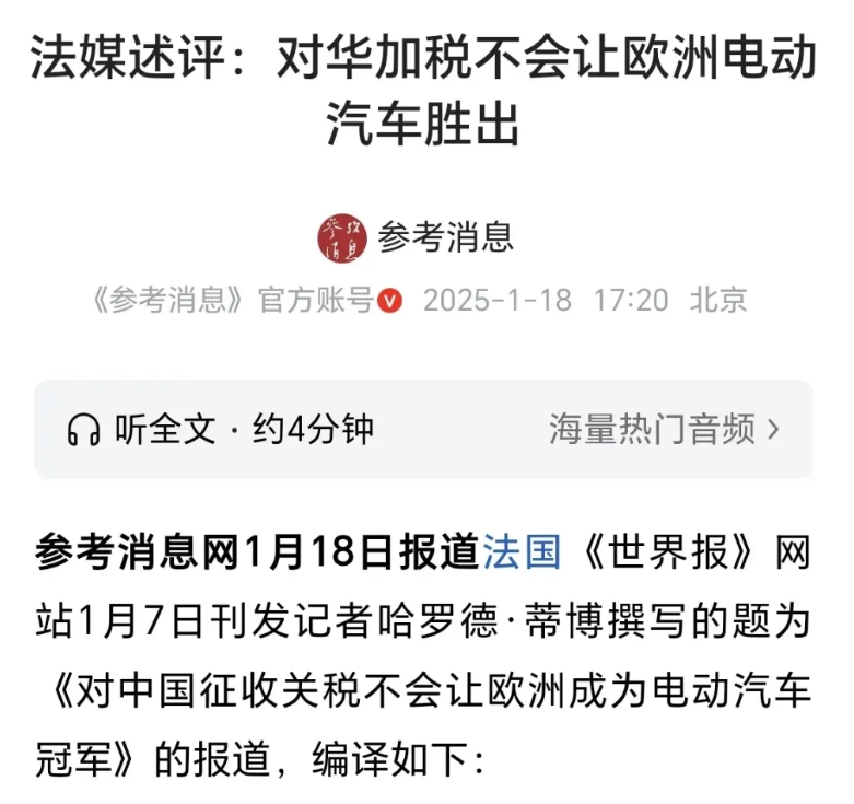 法国媒体承认了现实! 法国媒体的消息说,欧洲即使对中国电车加税,也不会让欧洲电动汽车获胜。 法国媒体指出,欧洲的电动汽车项目,根本不具备与中国竞争的实力。 事实上,法国媒体这次说的没错。欧洲只愿意听从美国和安排和旨意,从而对中国电动汽车加税,但是这于事无补,中国电动汽车的崛起,岂是一点关税能阻止的吗?就欧盟当前的电动汽车水平,拍马也是赶不上中国了,这点欧洲得承认。 不仅是法国媒体,此前德国媒体就已经指出了这一点 ,只是可惜欧盟的高层对此不以为然。