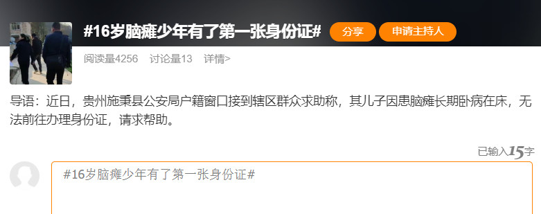 《16岁脑瘫少年有了第一张身份证:无法起床,民警亲自上门办理,大爱无疆》 最近,在贵州省施秉县的户籍办理窗口,工作人员接到了一位居民的求助。 这位居民说,他的儿子因为脑瘫一直卧床在家,无法亲自到窗口办理身份证。 根据《九派新闻》的消息 得知这一情况后,民警们立刻行动起来,第一时间赶到这位大哥的家中,为他儿子上门办理了身份证。 办理完成后,这位大哥非常感动,对民警们表达了深深的谢意。 听说当时民警们为了这次上门服务,带上了各种办公设备,而且在拍摄过程中,因为脑瘫患者的特殊情况,民警们多次尝试才成功完成了身份证的拍摄。 他们很有耐心! 一方面,我们要为这些能够主动下乡服务群众的民警点赞,他们真正做到了为人民服务; 另一方面,我们也希望脑瘫患者,能够得到更多的关爱和支持,帮助他们把生活经营得越来越好。