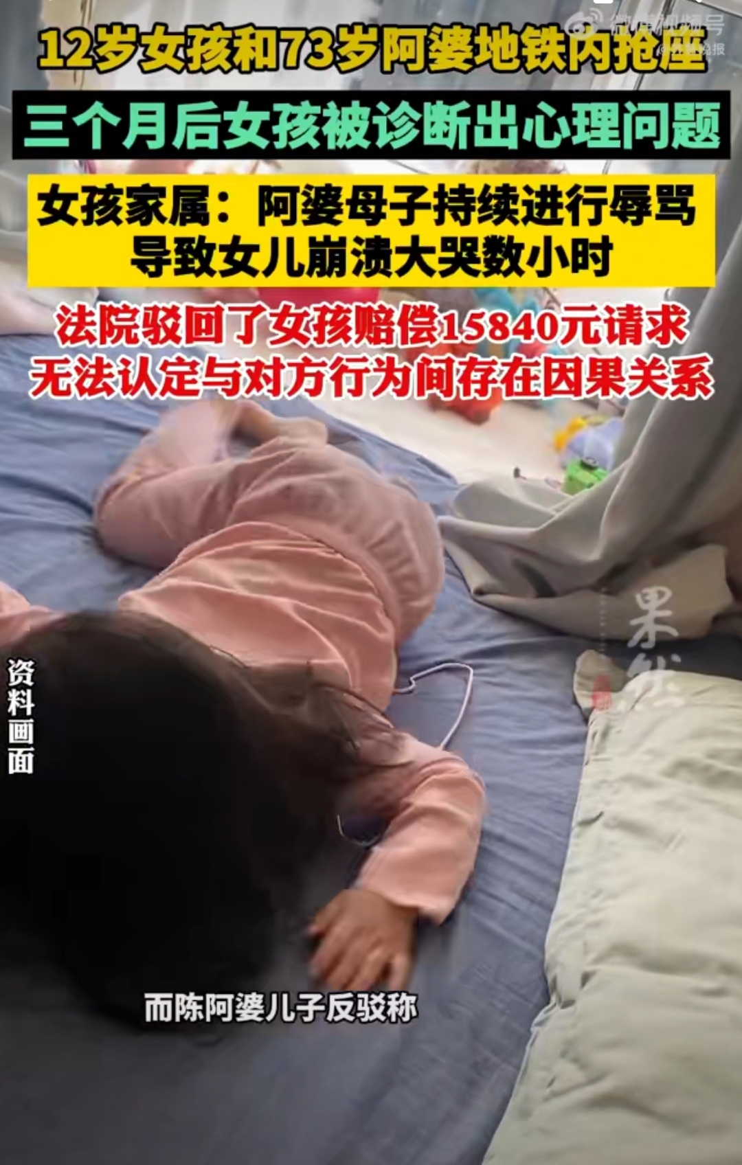 12岁女孩与73岁老人抢座,还一屁股做到老人身上,最后小老虎没干过老老虎,回家就得心理障碍病了,到法院起诉老人,索赔15840元,被法院驳回了。