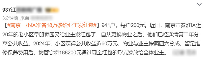 临近春节,真是趣事连连,南京秦淮区有个老旧小区,名叫皇册家园,竟然给业主们发红包了,红包总额高达188200元。 也就是说,每位业主都能收获200元的惊喜。 根据《937江苏新闻广播》的消息 这一年,小区的公共收益超过了60万元,业主和物业按照四六的比例进行了分配,在扣除了一些必要的维修费用后,剩余的钱全部发给了业主。 此事传开后,很多网友羡慕得都快流口水了,“自己怎么就没有碰上这么好的小区,这么好的物业?” 其实,业主和物业之间的矛盾一直都有。 为什么有的小区能在业主和物业的共同努力下,资产不断增值,业主也跟着沾光呢? 这确实是个值得我们深思的问题。 或许,物业不应该只盯着房屋的维修基金和业主的钱包,而应该想办法和业主实现互利共赢,这样双方都能得到自己想要的结果。 物业能够健康有序地运营,业主也会全力支持这样的物业。 然而,要想让所有小区都走上正轨,可能不仅需要物业的努力,也需要业主的全力配合。 双方需要平等沟通,解决分歧,共同推动小区健康发展。 否则,只要有一方掉链子,就可能导致小区陷入恶性循环,物业管理不善,业主不愿意交物业费,一系列问题接踵而至,只会让矛盾越来越深,最终可能导致整个小区的管理运营崩溃。