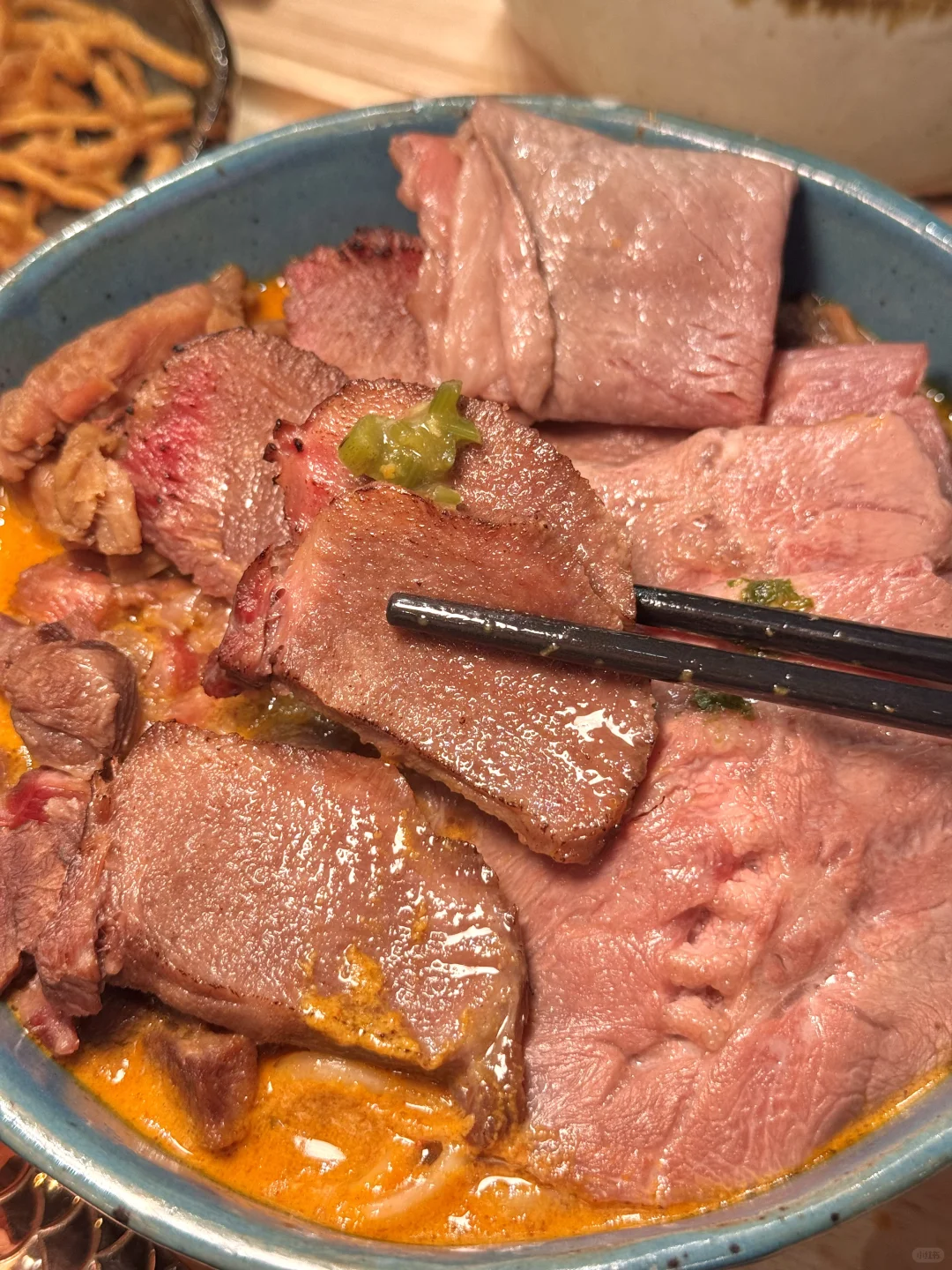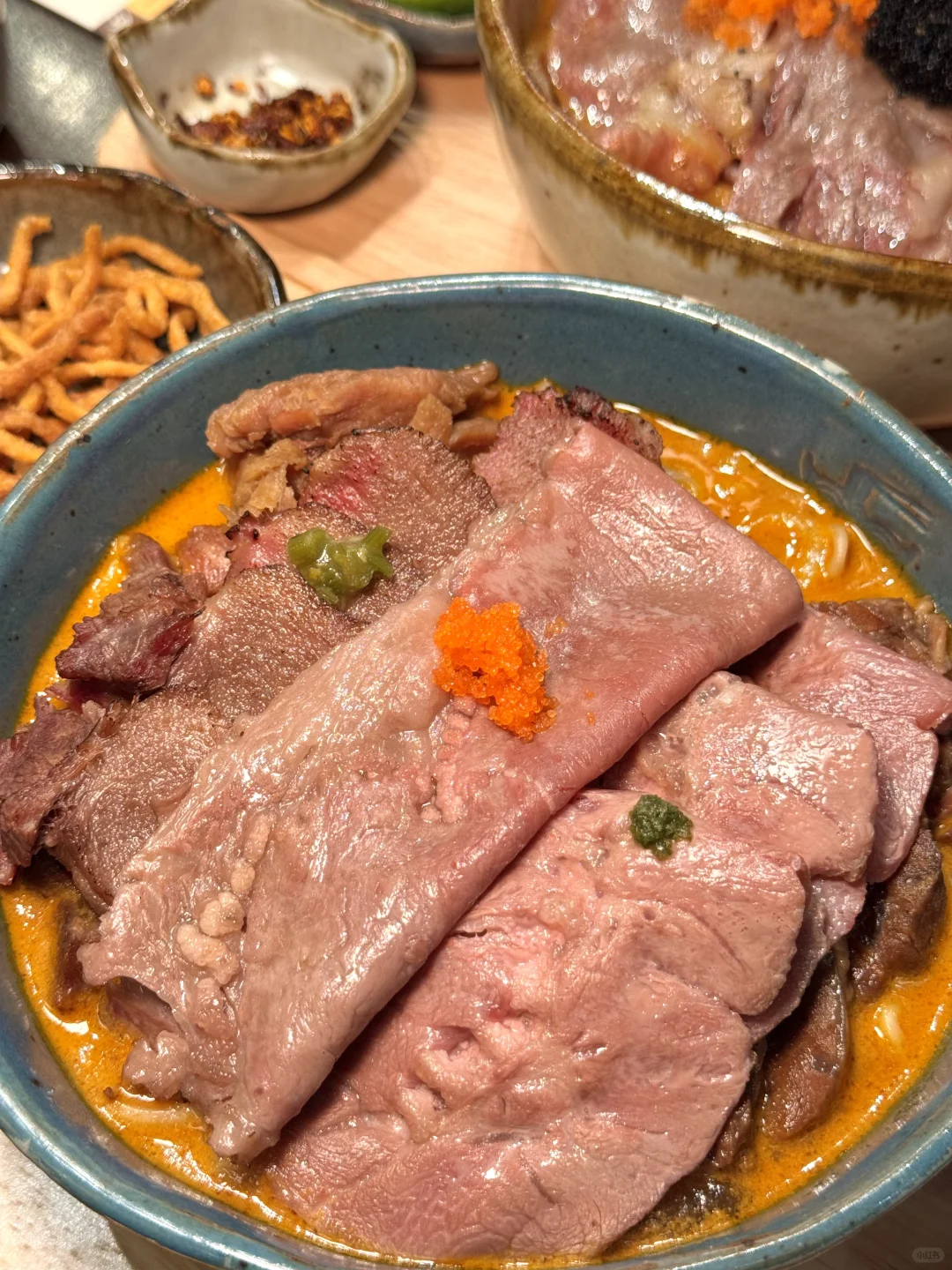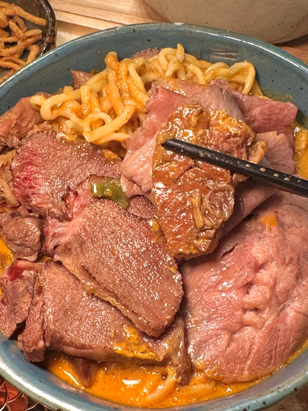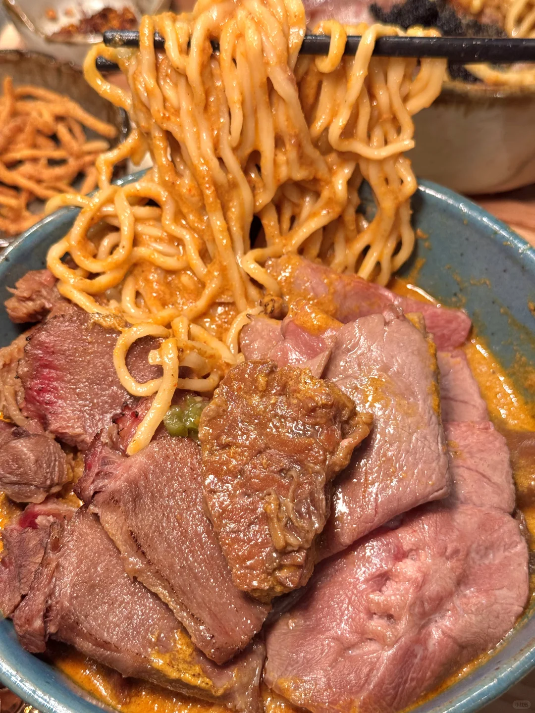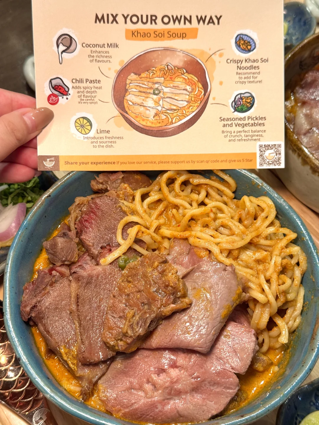 要不是泰国本地朋友带路 我真的找不到这么资格的泰北咖喱面🍜 这家在清迈超级火的网红店!没想到也开来暹罗百丽宫啦!他家主打特色就是牛肉黄咖喱khao soi面🍜牛肉炖得软嫩耙糯真的是入口即化 面条也是很劲道 第一口就让人惊艳!他家还有澳洲和牛🐂咖喱面和特色龙虾面也是爆炸无敌好吃😋怪不得排队的人那么多!而且几乎全是泰国本地人!大家尽量避开饭点去不然人真的很多!