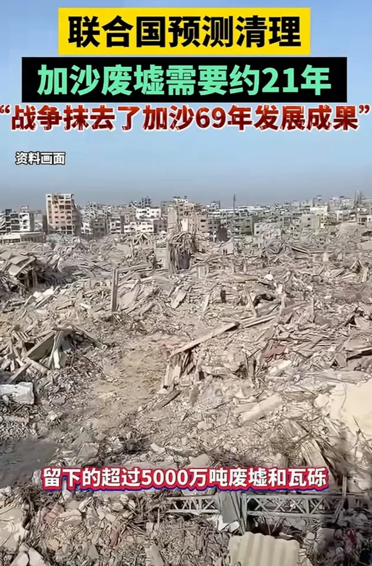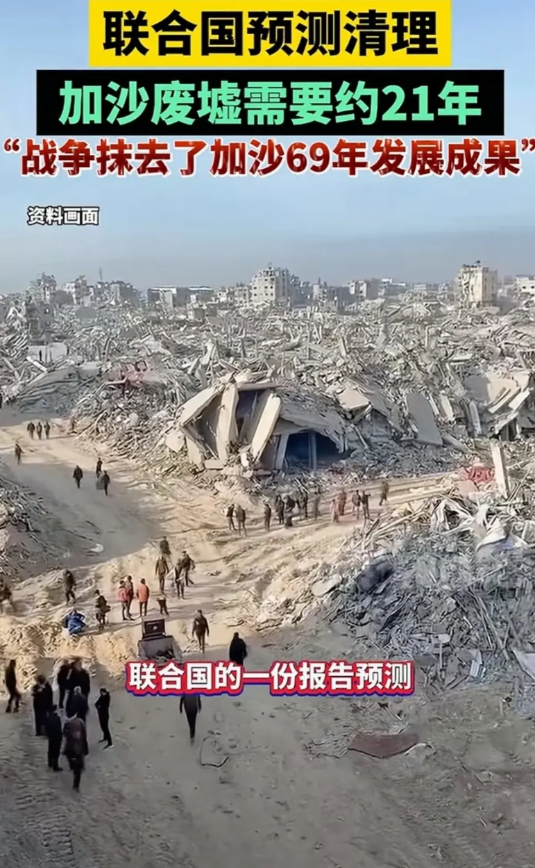 联合国预测清理加沙废墟需要约21年时间,但加沙再也回不去了。 加沙没有任何自然资源,纯粹靠外界输血发展。 如今全都被以色列轰炸成废墟,没有外部国家会进行投资。 以色列也不会让加沙地带再次发展起来,从而威胁以色列。 这就是小国的悲哀,又没有抗争到底的勇气,一盘散沙,只能任人宰割。