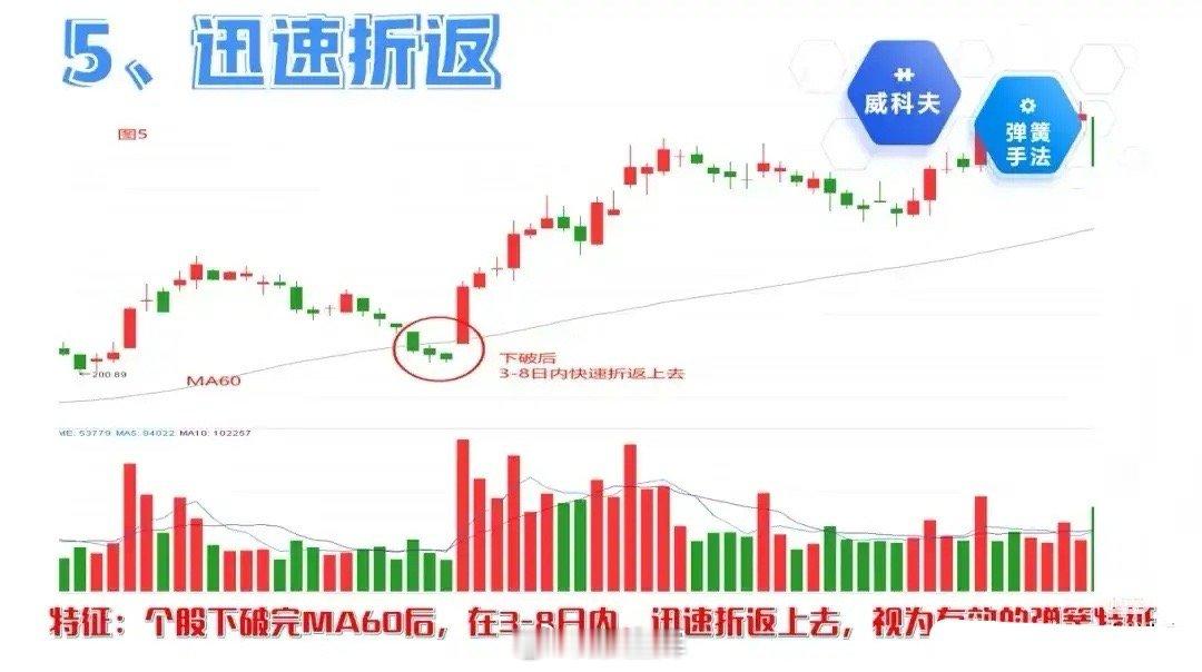 特征:个股下破完MA60后,在3-8日内,迅速折返上去,犹如弹簧被压至极点后猛然释放,此乃弹簧战法之精髓,预示着一波强势反弹即将来临的特征。(图5)
