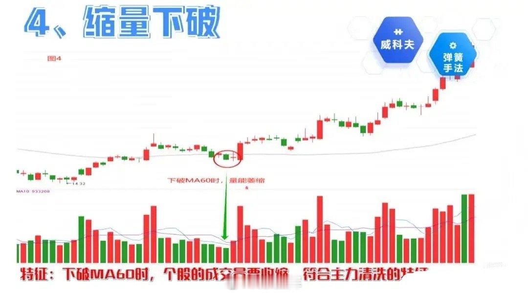 特征:下破MA60时,成交量却悄然收缩,仿佛是大浪淘沙后的宁静,这正是主力悄然清洗浮筹,静待时机的表现,同时也是主力清洗的特征。(图4)