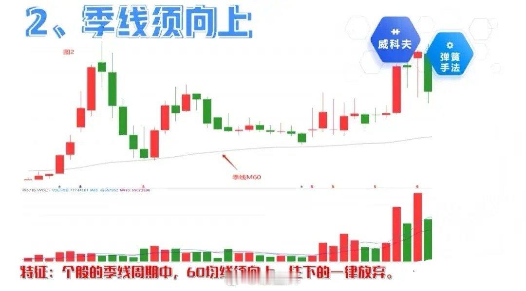 特征:深入个股季线周期,个股的季线周期中,60均线须向上,唯有如此,方显英雄本色,那些往下走的,则要放弃。(图2)