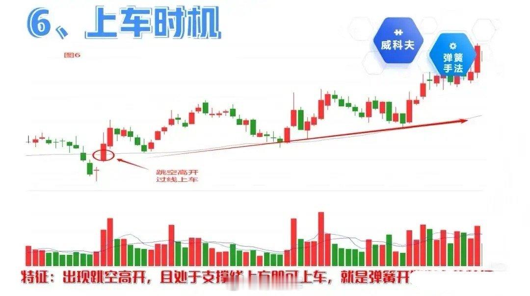 特征:出现跳空高开,且处于支撑线上方,这便是弹簧蓄势待发,即将一飞冲天的信号,此刻上车,正是好时机特征。(图6)