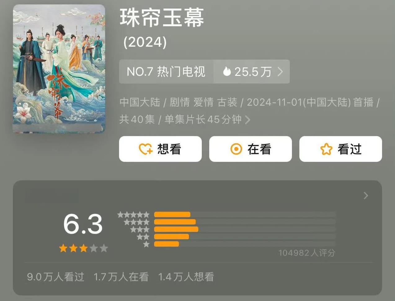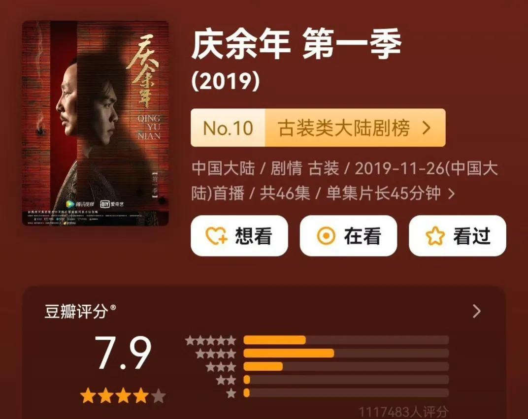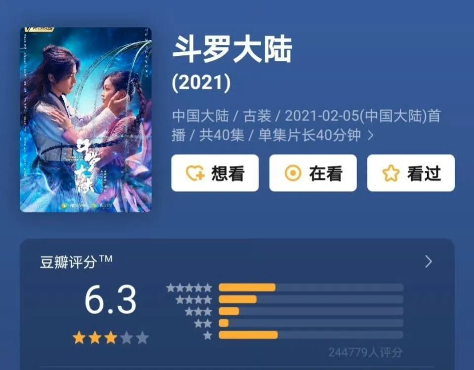 《大奉打更人》豆瓣开分5.4,大家觉得高了还是低了? 别的不说,看打分人数,王鹤棣这个“流量”有点虚。 首先它的分型是没问题的,路人多,并没有粉丝说的恶意打分。而且才6.9万人打分,如果粉丝基数大,完全可以控住。 比如《珠帘玉幕》和《斗罗大陆》,就是粉丝发力,五星比例高,硬生生把分拉高的。 《斗罗大陆》才是标准恶意打分,粉黑大战的分型。 所以大奉这打分还是挺真实的, 对比下新丽其他男频剧 《庆余年》第一季打分人数111万,第二季 人数33万 《赘婿》人数28万 《大奉打更人 》人数6.9万 不管说他爆了还是扑了,打分人数说明一切,只能说白瞎了这么大的阵仗,播出效果真是不如远预期,难怪王鹤棣最近愁眉苦脸。