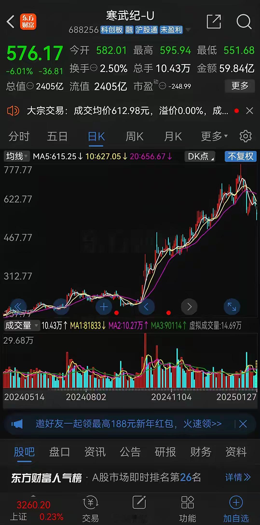 科技股今天集体杀跌,寒武纪盘中一度跌到了551.68元,跌幅一度达10%。其实这个都在预料之中,不跌反而不正常了。