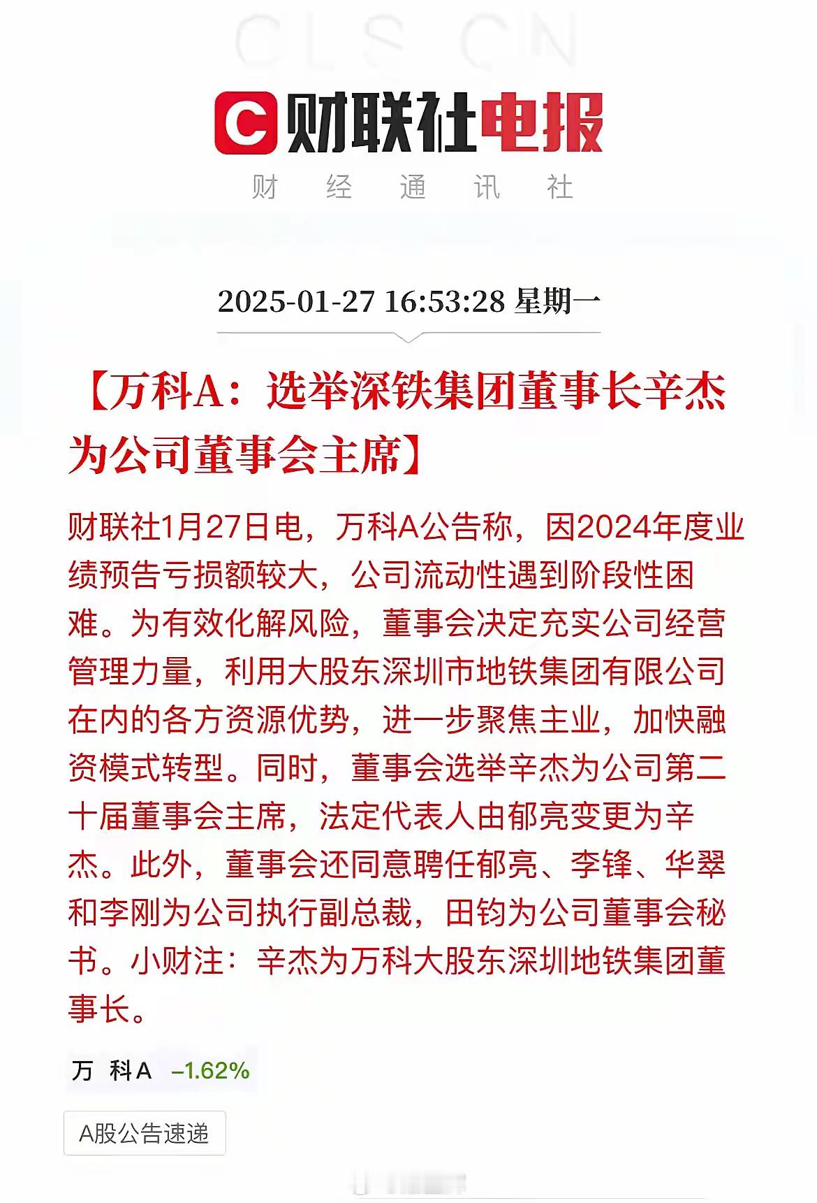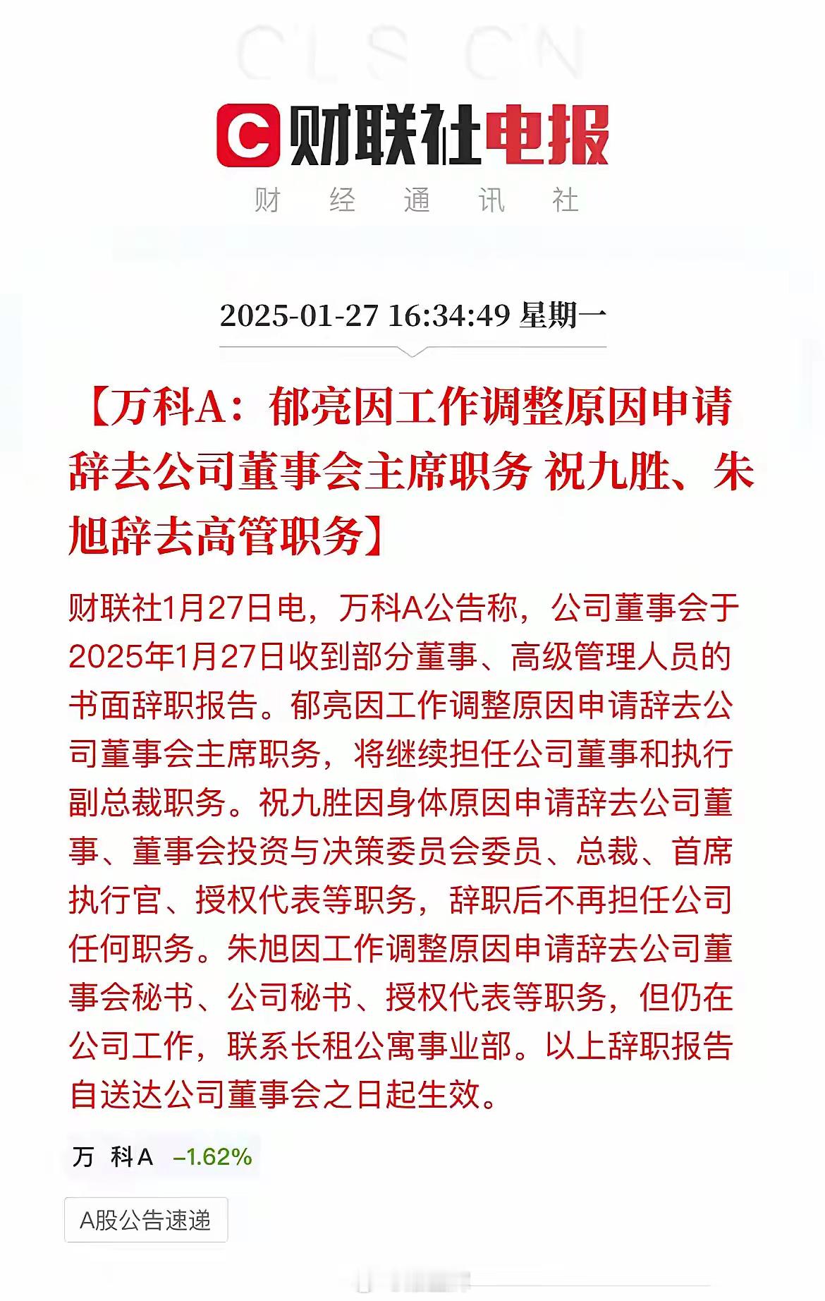 今天盘后万科突然发布公告称,公司董事会于2025年1月27日收到多位高管的书面辞职报告,其中包括董事会主席郁亮,董事、总裁兼首席执行官祝九胜以及董事会秘书朱旭!