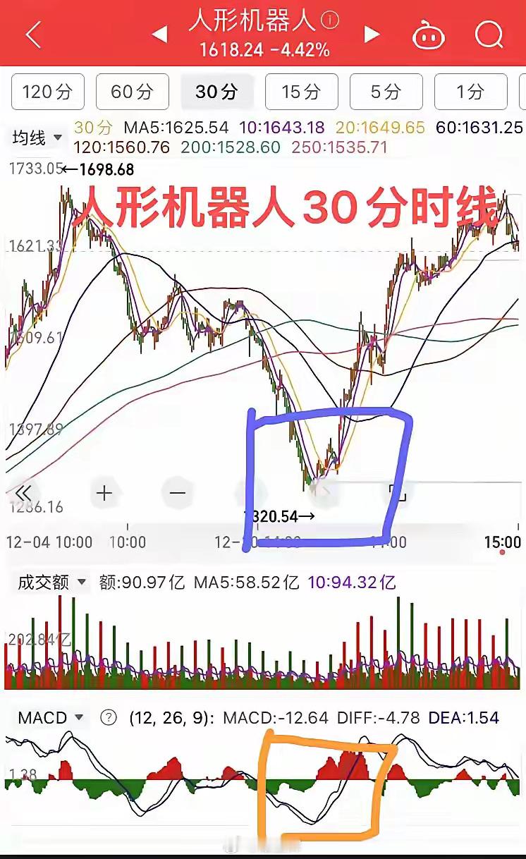 然后到了1320左右板块就触底拉升了!这时候是不是进场机会?第十一章进场机会条件已经说明白:就是30、60分时线交叉,结合大盘走势。切换到图二、图三,30、60分时线黄、紫色框MACD水下交叉,条件已经满足,对应图四滚珠丝杠龙头,你要是想介入应该是1月7、8号最合适。