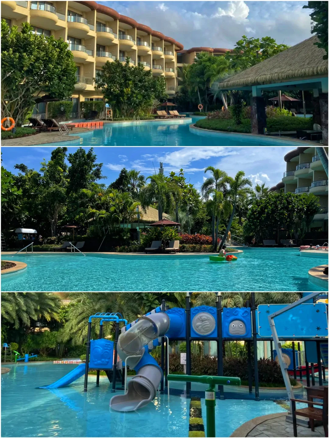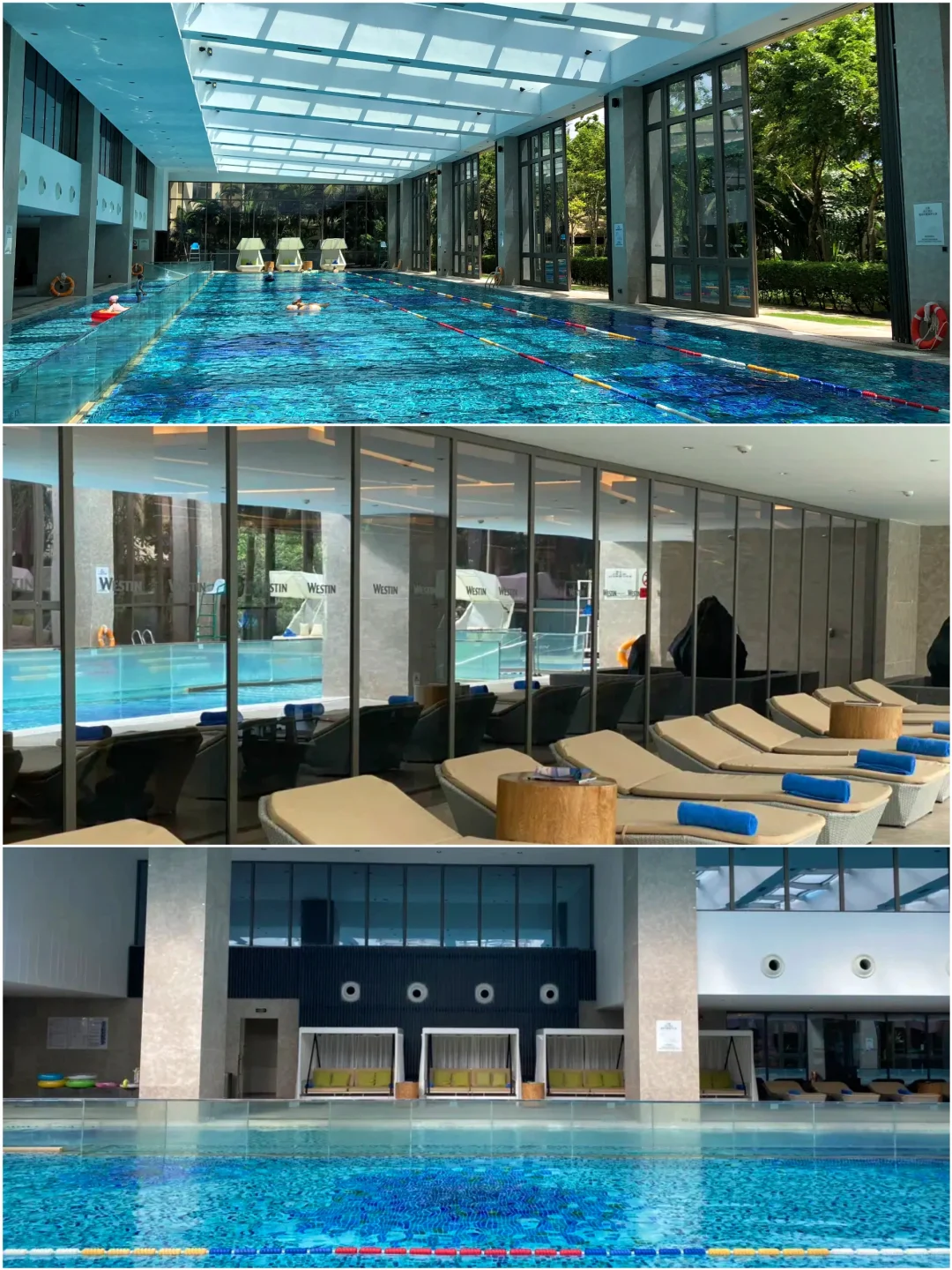 酒店有三个泳池,室内的50米标准恒温泳池,室外还有儿童泳池和成人泳池,儿童泳池下午还有泡泡大战。