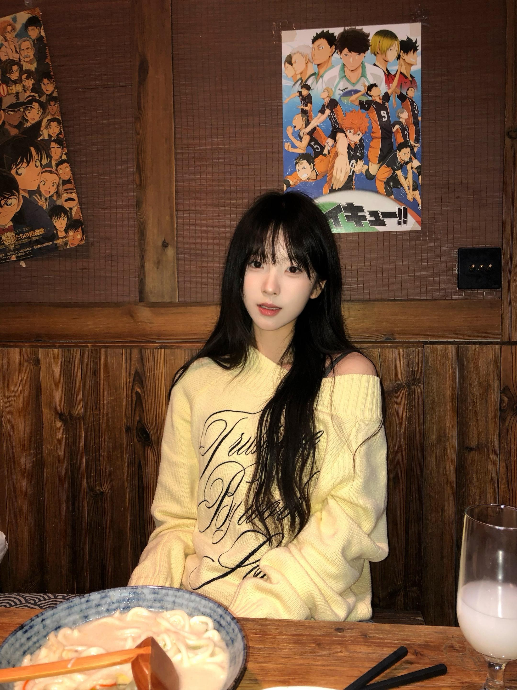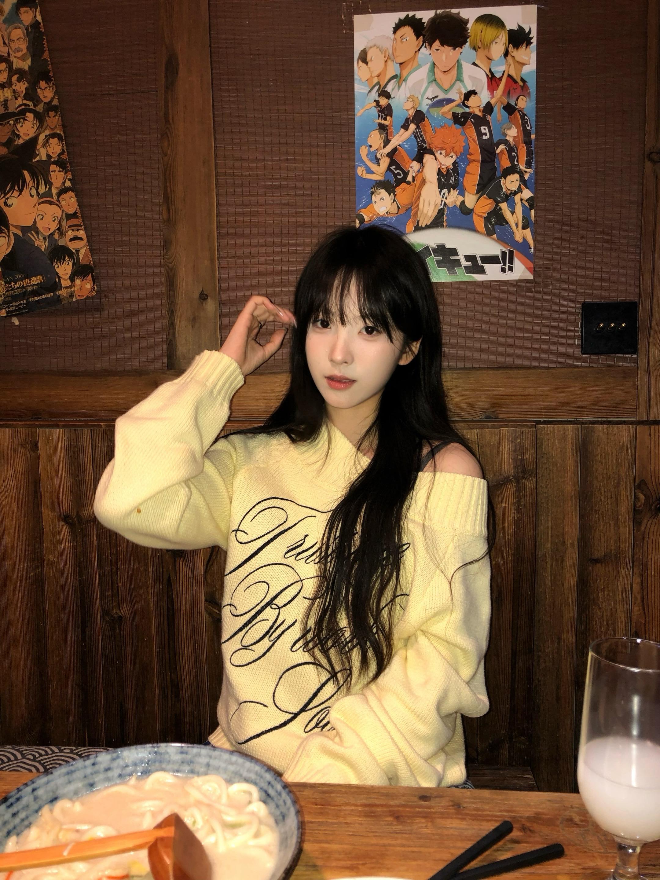 一位长相漂亮、身材出众的姑娘,穿上了一件对身材要求极高的紧身款一字肩粉色针织衫搭