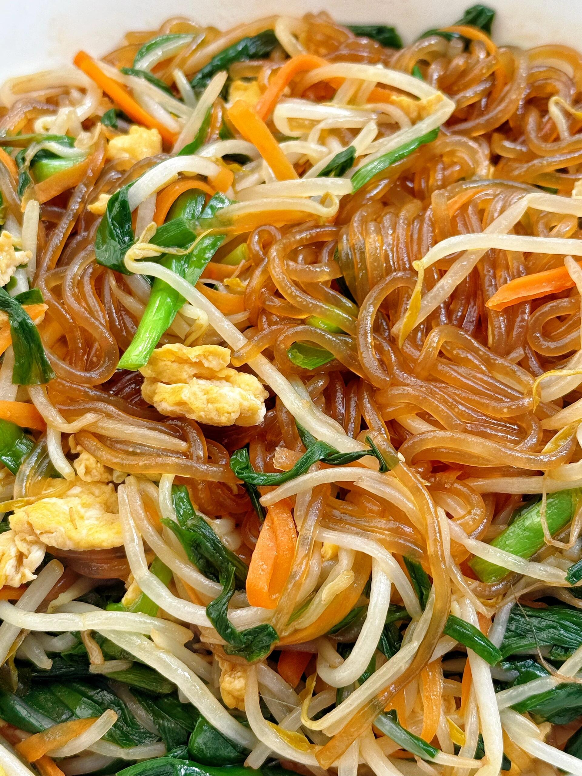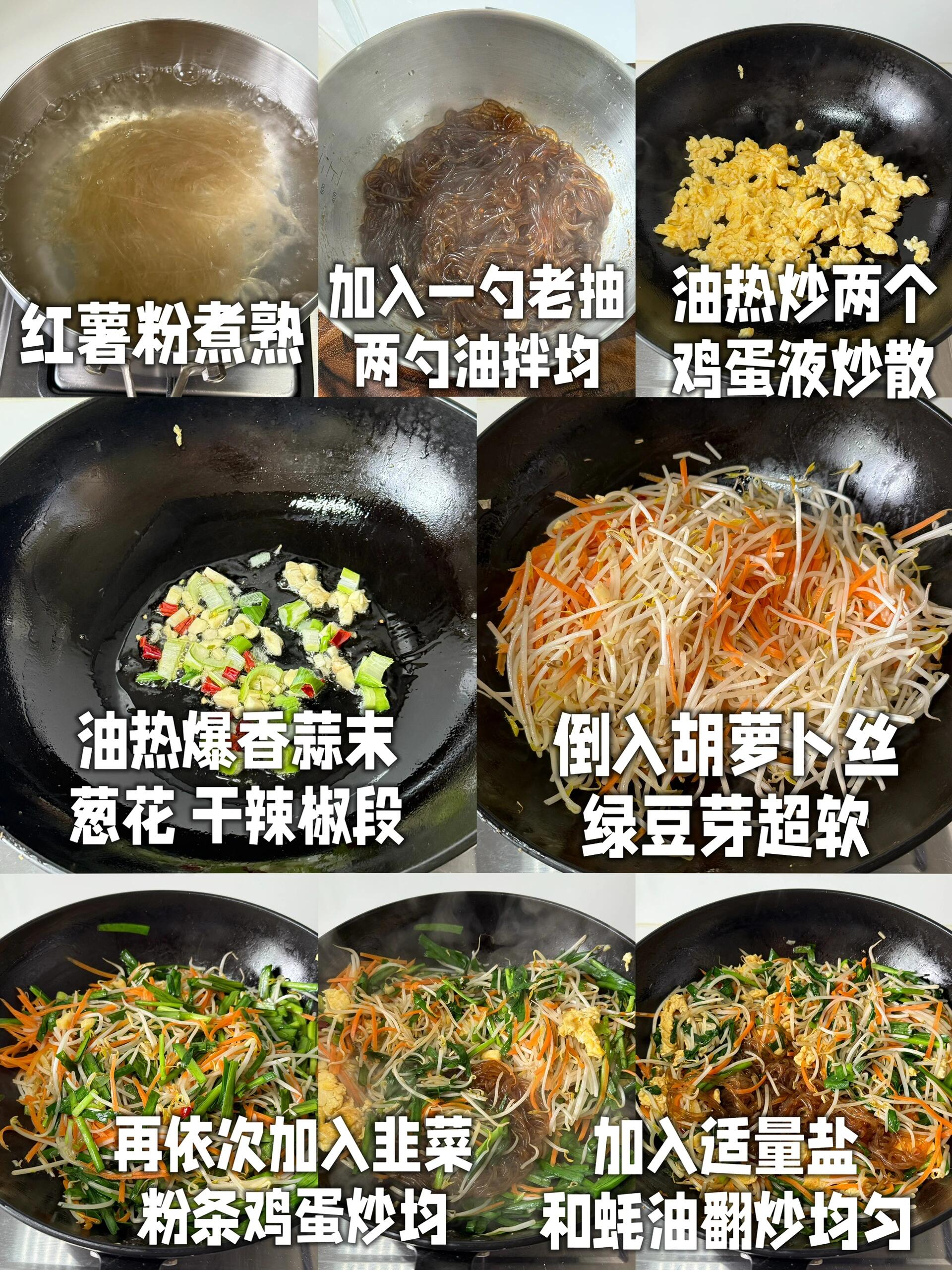 炒合菜,简单又下饭,卷饼,拌饭都好香啊 准备食材:绿豆芽,韭菜,红薯粉条,胡萝卜,鸡蛋 制作方法:1、红薯粉煮熟捞出,➕一勺生抽,两勺食用油拌均备用 2、锅中热油两个鸡蛋液炒散备用 3、油热爆香蒜末葱段,干辣椒段,倒入胡萝卜丝和绿豆芽炒软 4、再依次加入韭菜,粉条和鸡蛋碎翻炒,加入适量盐和蚝油翻炒均匀即可 卷春饼,煎饼,拌饭都很好吃哦!
