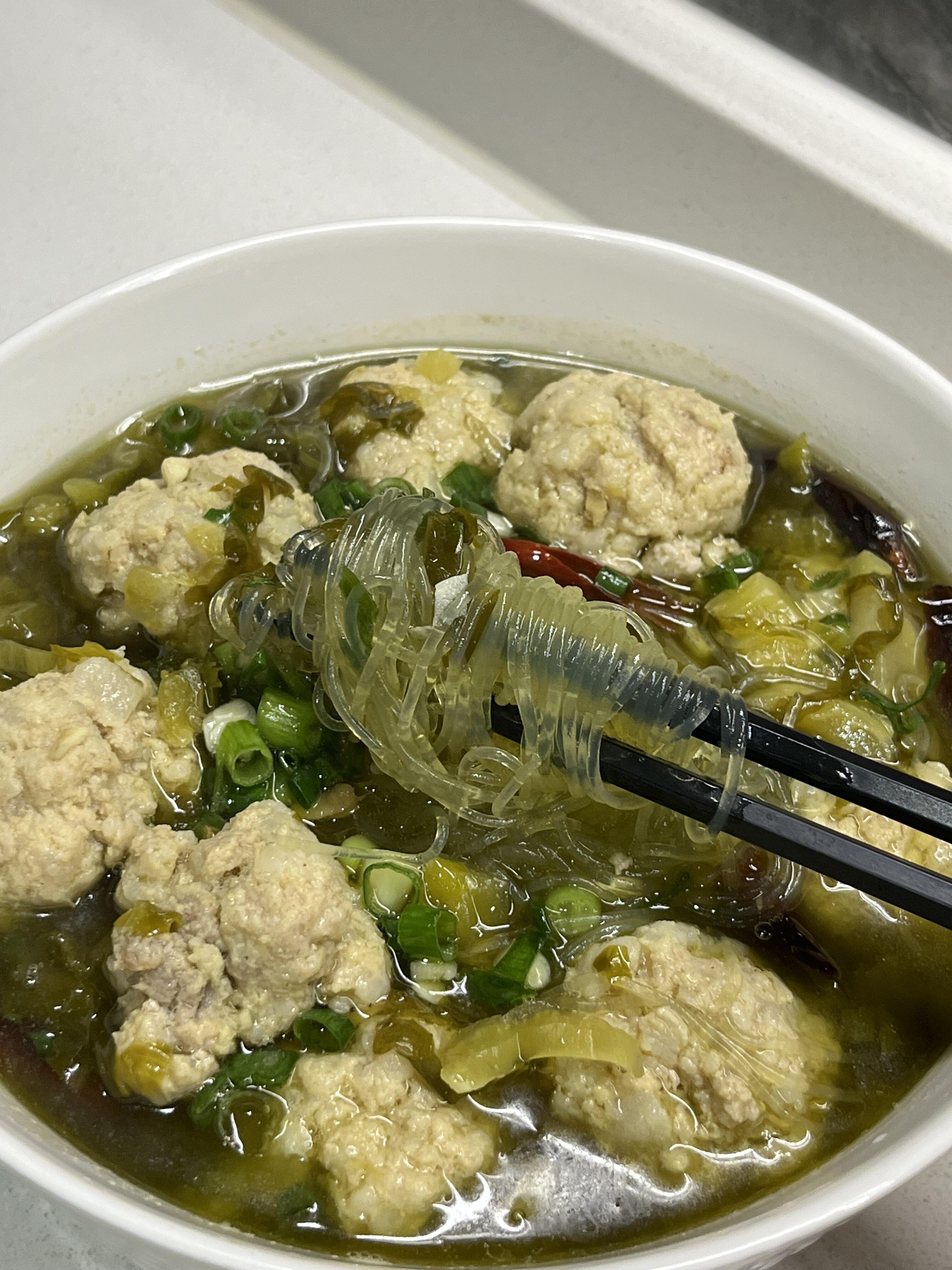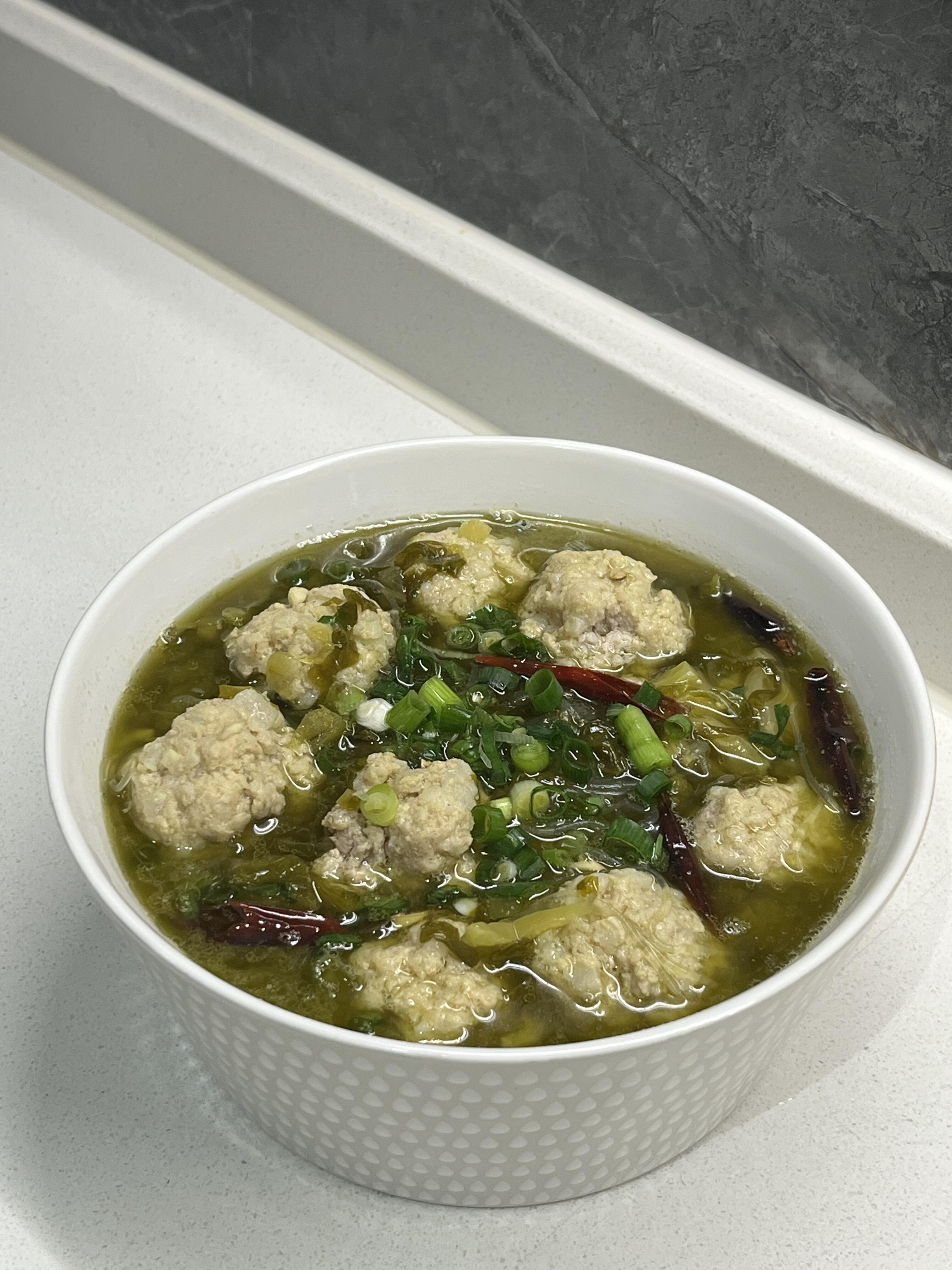 超级开胃的酸菜粉丝丸子汤 酸菜汤真的酸酸辣辣超级开胃!加上肉丸子和粉丝,简直绝配可以用瘦点的肉,我这个肥肉太多了点 1、肉末加盐,白胡椒粉,葱姜水,淀粉抓匀摔打一下,再捏成丸子 2、油热下姜蒜末,酸菜,干辣椒炒香,加入适量清水烧开,加盐,白胡椒粉,味精调味,放入肉丸煮熟,再加入粉丝煮熟撒上葱花即可