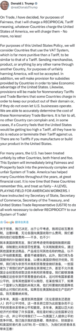 特朗普今天(北京时间2月18日)写道:“关于贸易,我已决定,出于公平考虑,我将征收互惠关税,这意味着,无论各国向美国收取什么费用,我们都将向他们收取费用——不多,也不少!”(全文很长,见图二)