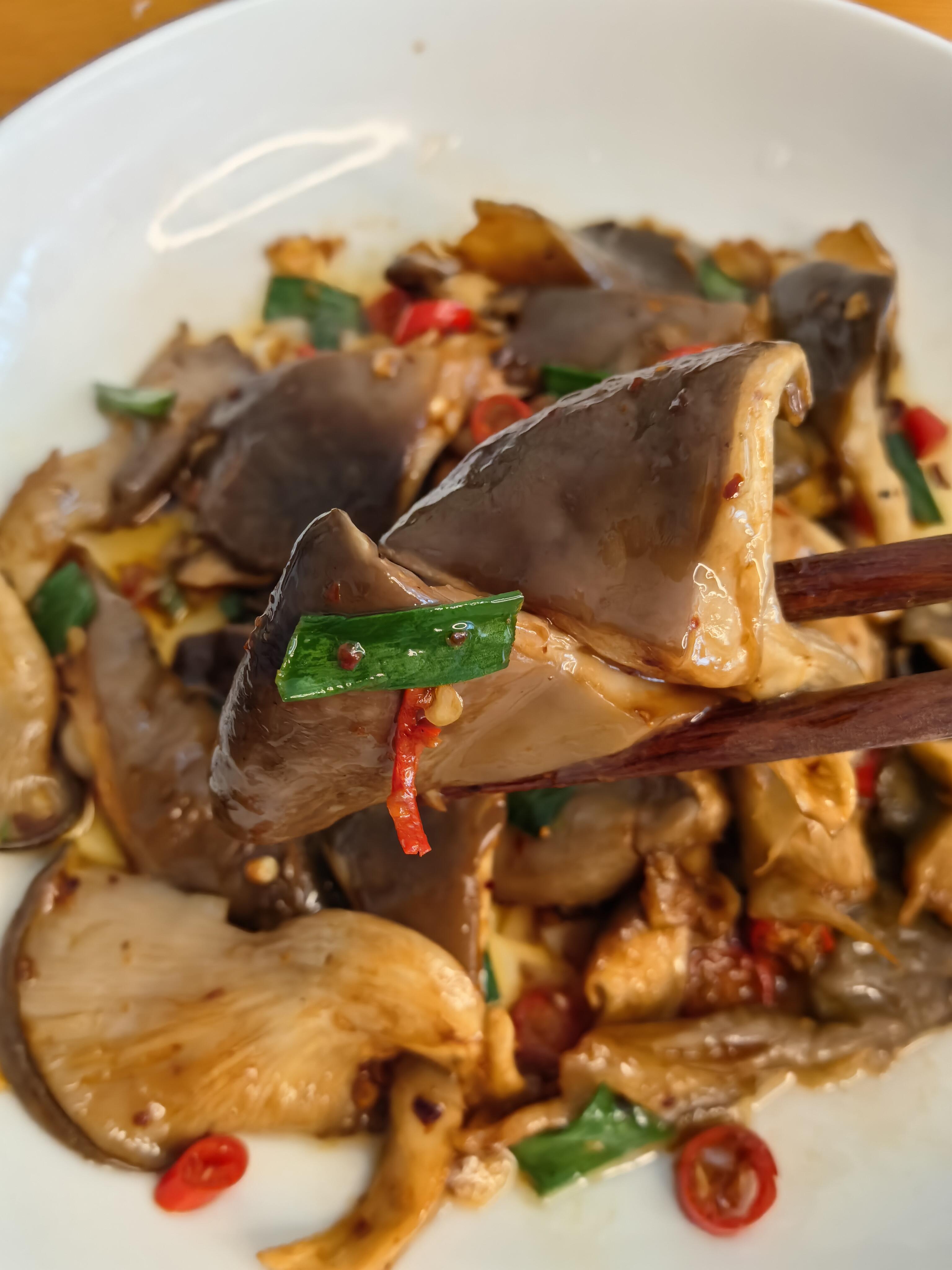 一定要试试这个吃法!比肉还好吃 平菇这么做真的超好吃!一定要试试!!! 鲜嫩爽滑,香辣多汁,真的不要太香了 配米饭绝绝子,一口一个停不下来,一盘一出锅炫不停啊!! 做法:1、平菇洗净,撕小块,焯水捞出沥干 2、热锅放油,放蒜末、从葱末、小米辣爆香 3、倒入平菇翻炒均匀,放2勺生抽、1勺蚝油、1勺辣椒面,大火翻炒均匀,撒入葱花即可出锅。