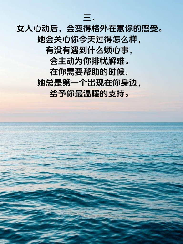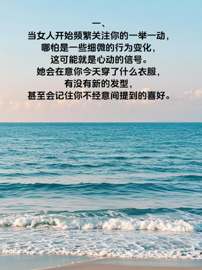 一、当女人开始频繁关注你的一举一动,哪怕是一些细微的行为变化,这可能就是心动的信号。她会在意你今天穿了什么衣服,有没有新的发型,甚至会记住你不经意间提到的喜好。 二、女人心动时,会不自觉地与你有更多的眼神交流。那眼神中透露出的羞涩与好奇,仿佛在诉说着她内心的情感。当你的目光与她交汇,她可能会迅速低下头,又忍不住再次偷偷看你。 三、女人心动后,会变得格外在意你的感受。她会关心你今天过得怎么样,有没有遇到什么烦心事,会主动为你排忧解难。在你需要帮助的时候,她总是第一个出现在你身边,给予你最温暖的支持。
