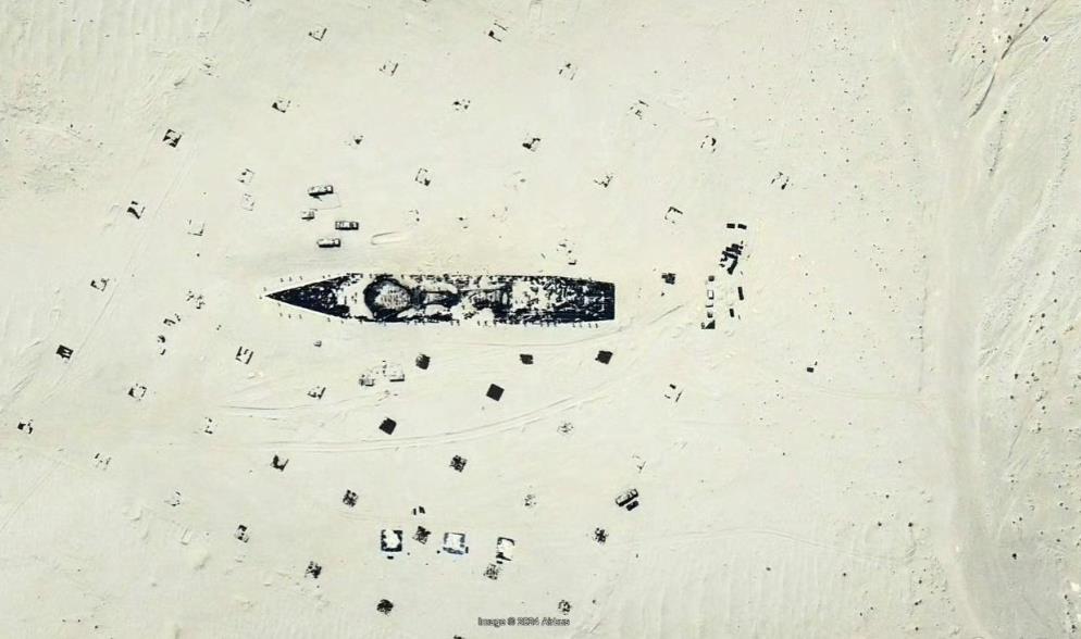 卫星图片显示两架美国海军E-2D“鹰眼”舰载预警机全尺寸模型标靶出现在两艘航空母舰模型标靶附近,而在这些航空母舰标靶附近还有多艘护航舰艇标靶,整个标靶系统覆盖约50平方公里,恰好模拟了美军一个或两个航母战斗群编队航行时的战位分布,几乎相当于在沙漠深处的“海洋”中完整复制了美军的航母战斗群,可见这一工程的规模之大。