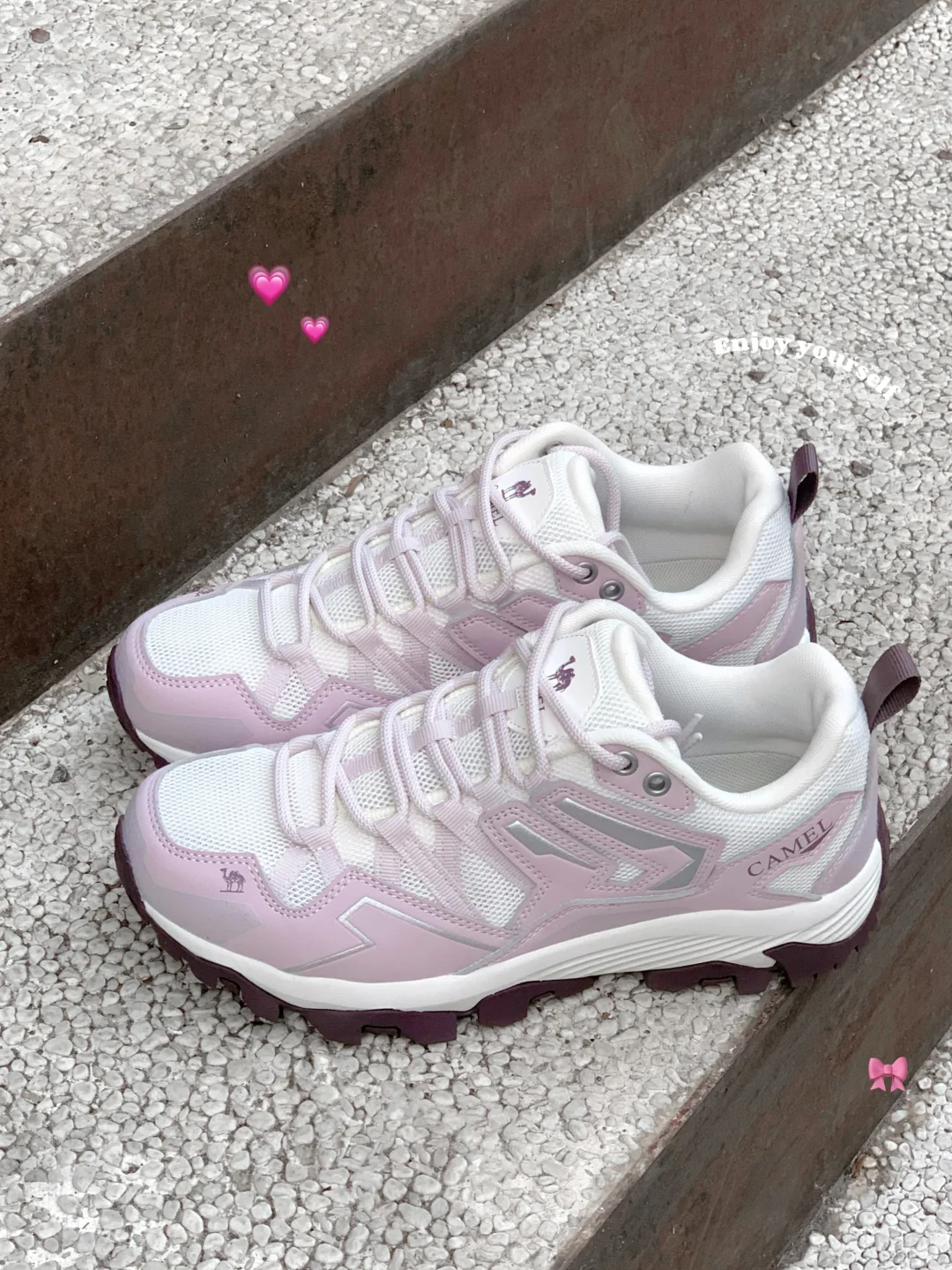 新年穿新鞋啦 新入的骆驼昆仑山 低饱和的粉紫配色也太嫩了 早春少女氛围感拿捏~ 这双鞋不仅适合日常穿搭,也可以周末去爬山徒步 鞋底是这种升级骆印耐磨橡胶鞋底 就像它家slogan写的“用科学定义防滑,每一步都足够稳” 是爬山徒步的好搭子,上脚也挺轻的