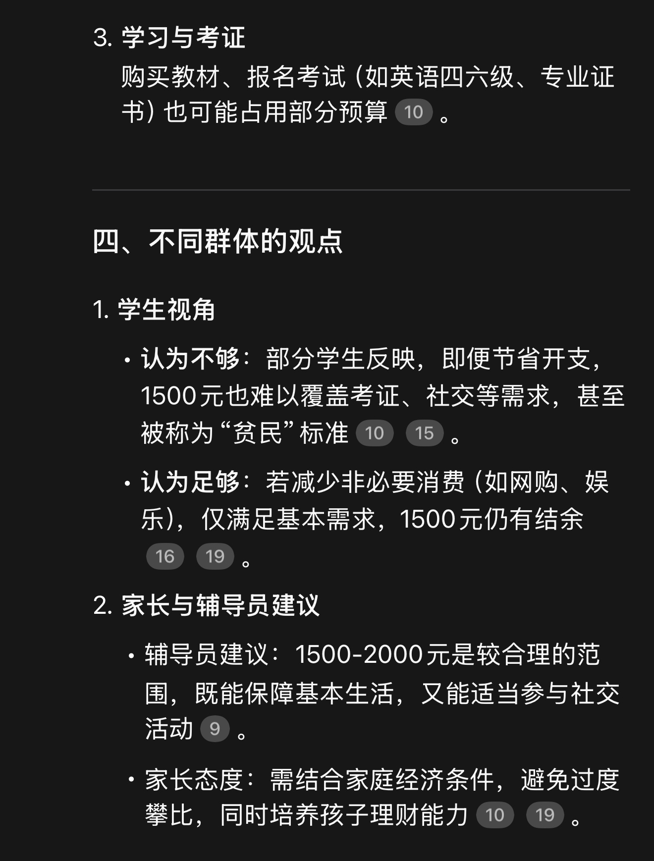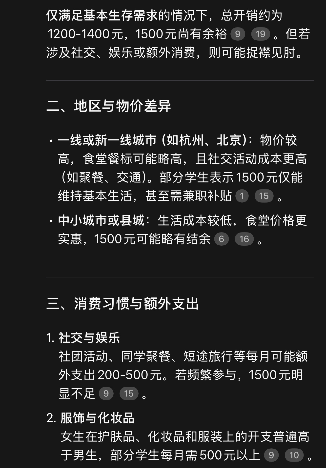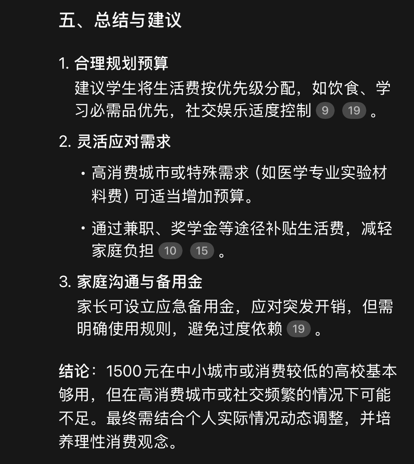 DeepSeek分析大学每月1500够花吗 deepseek总结:1500元在中小城市或消费较低的高校基本够用,但在高消费城市或社交频繁的情况下可能不足。最终需结合个人实际情况动态调整,并培养理性消费观念。